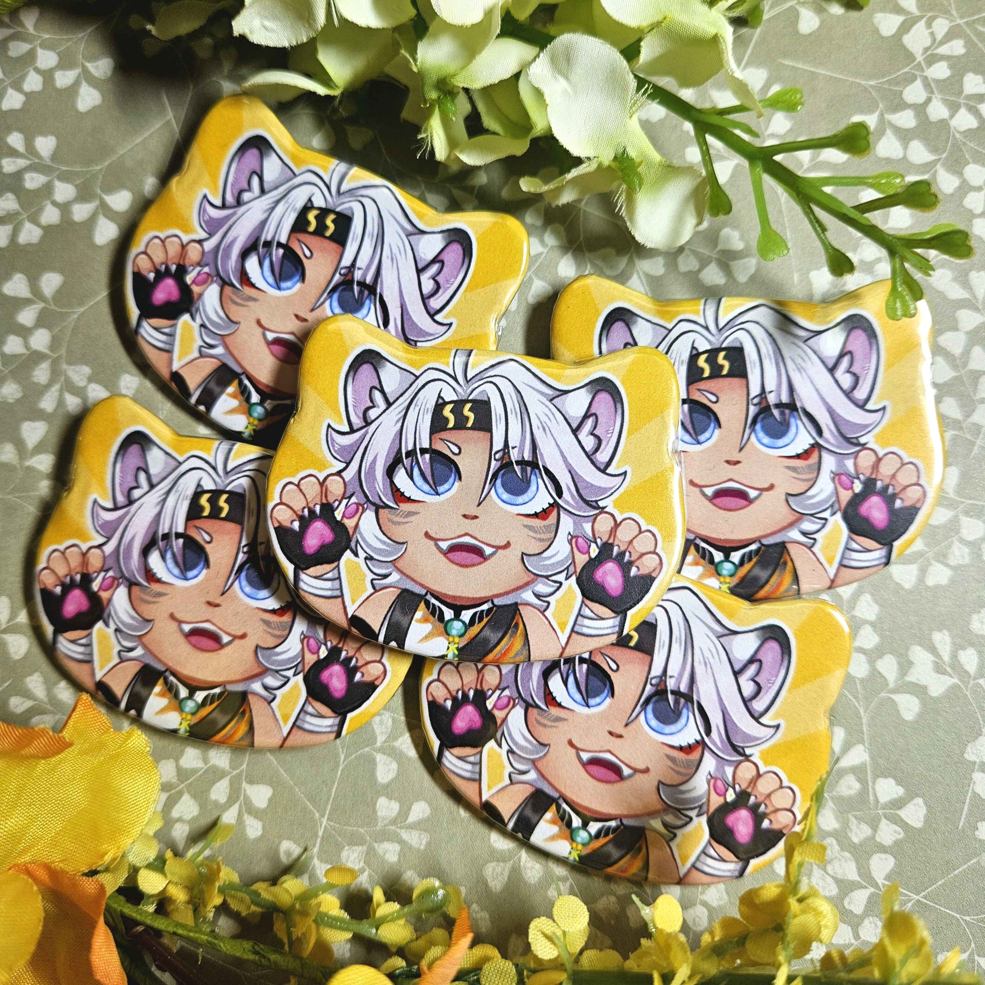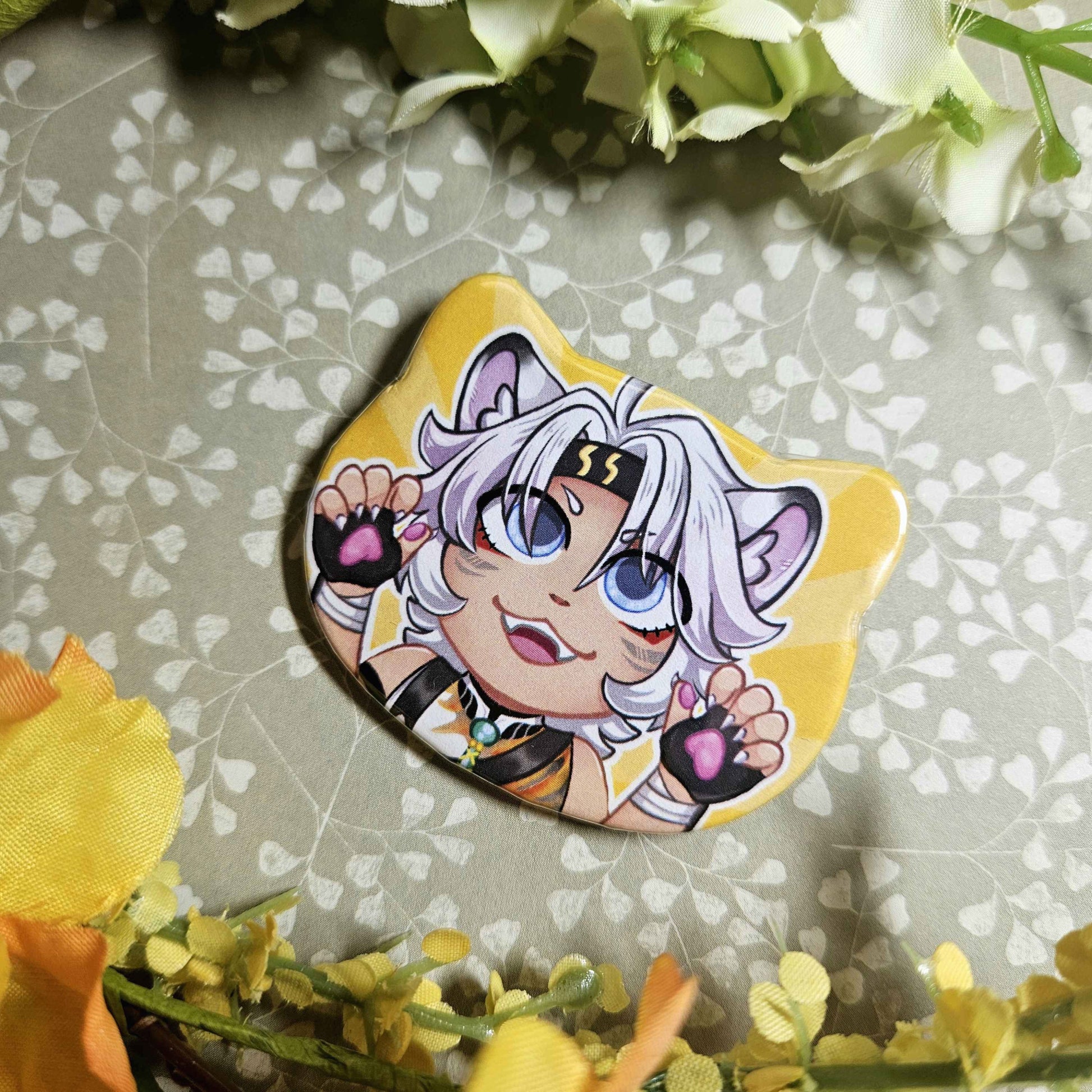 This is a cat-shaped, pinbacked button measuring approximately 2.5" wide.