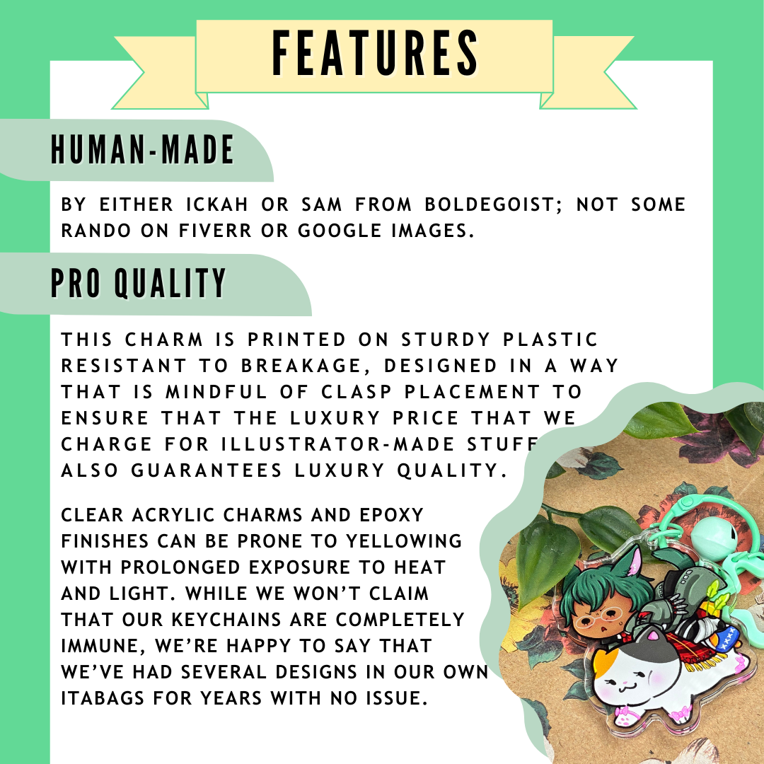 Acrylic charms are made of plastic, which means that they are waterproof but somewhat vulnerable to scratching. The epoxy coating turns it from artwork to functional artwork - it has some durability, but still needs a level of respect.