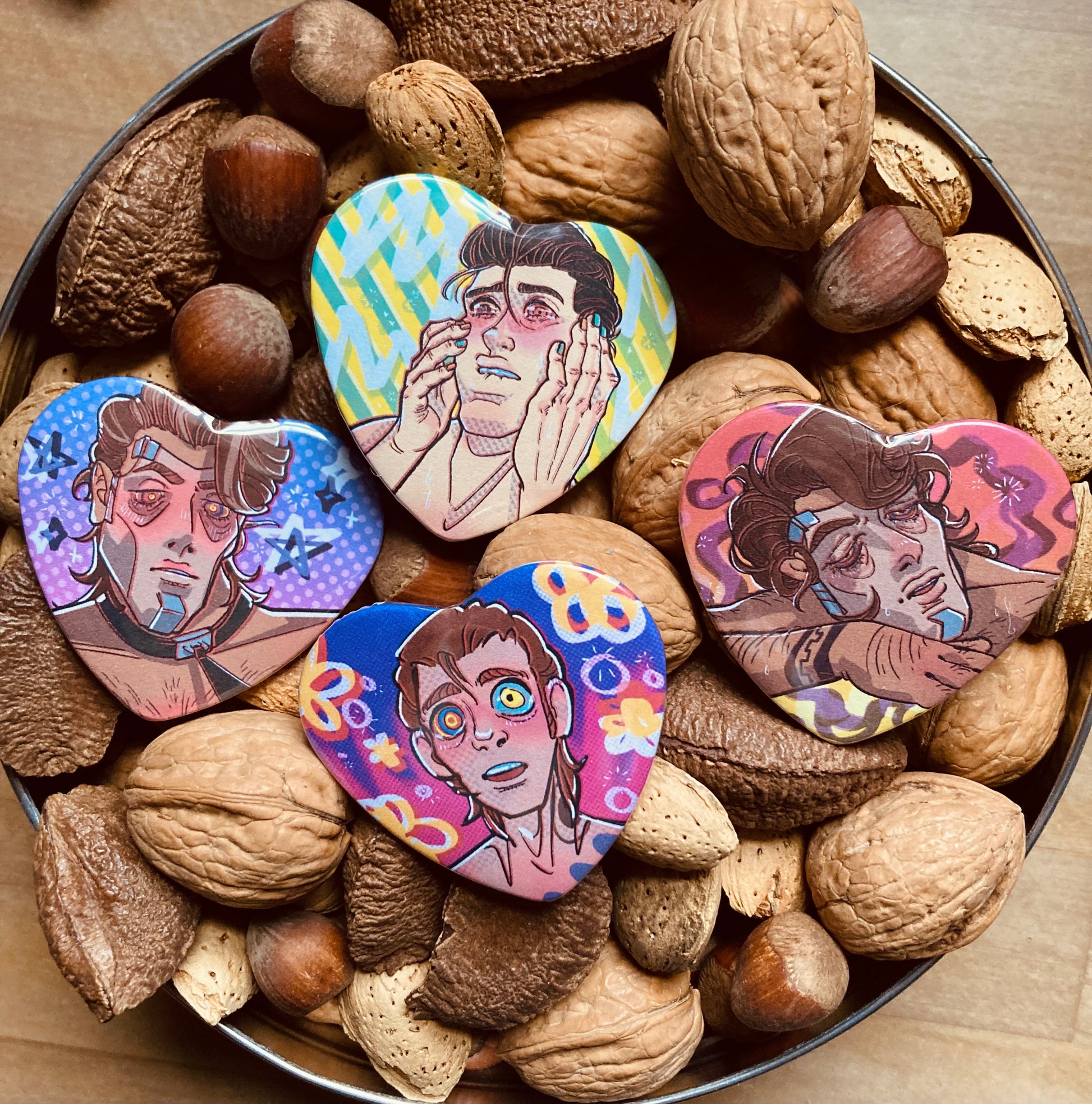 This is a heart-shaped, pinbacked button measuring approximately 2.5" wide.