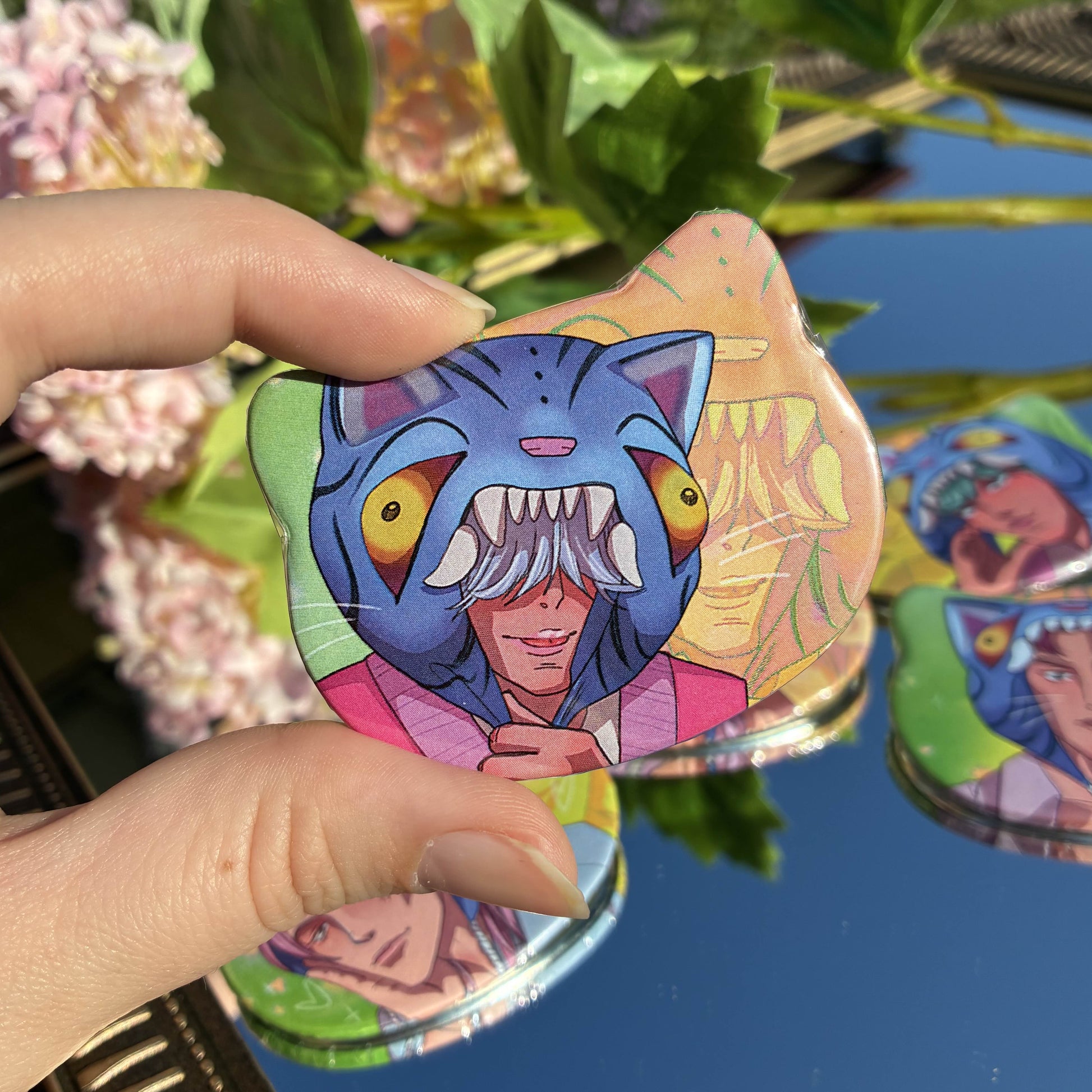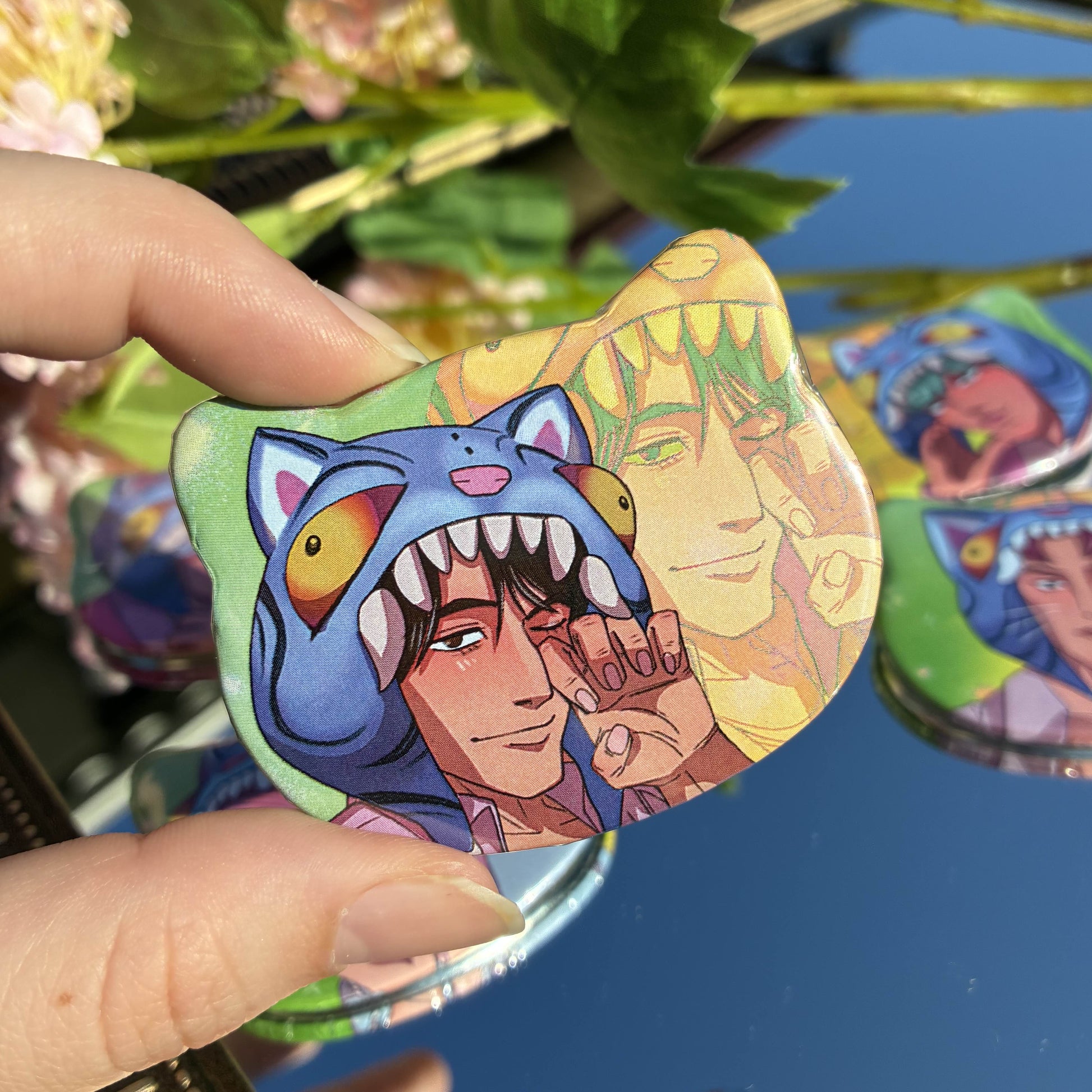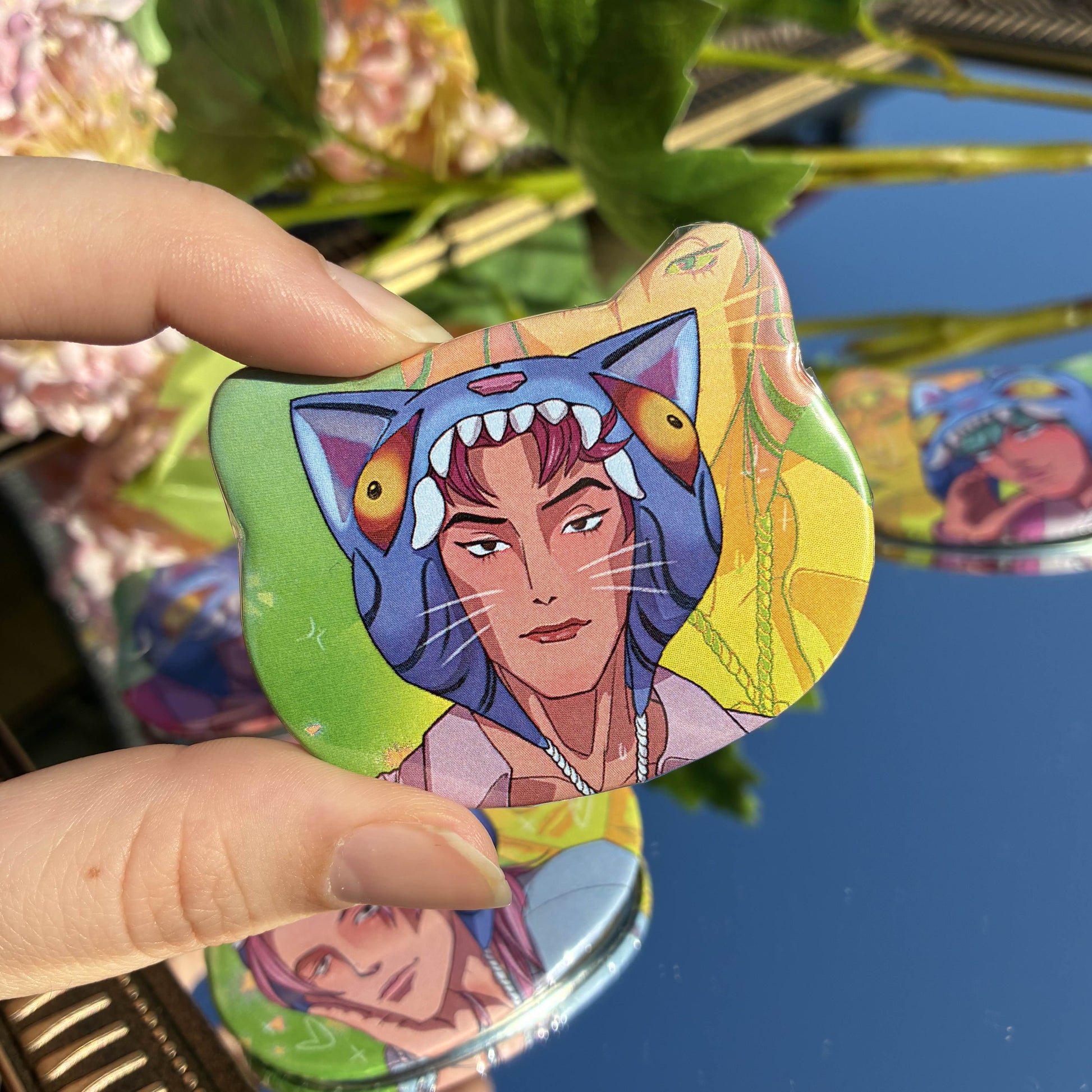This is a cat-shaped, pinbacked button measuring approximately 2.5" wide.