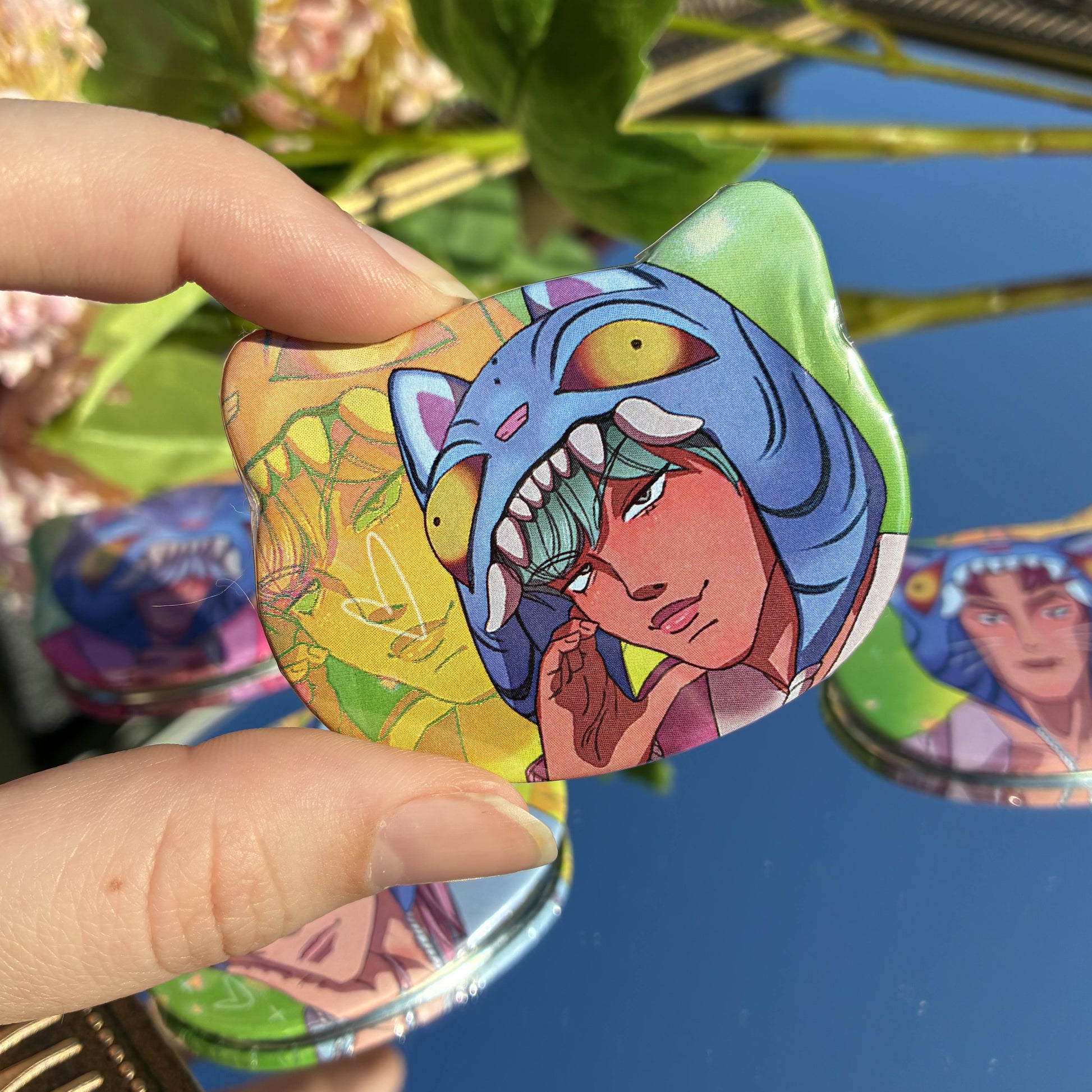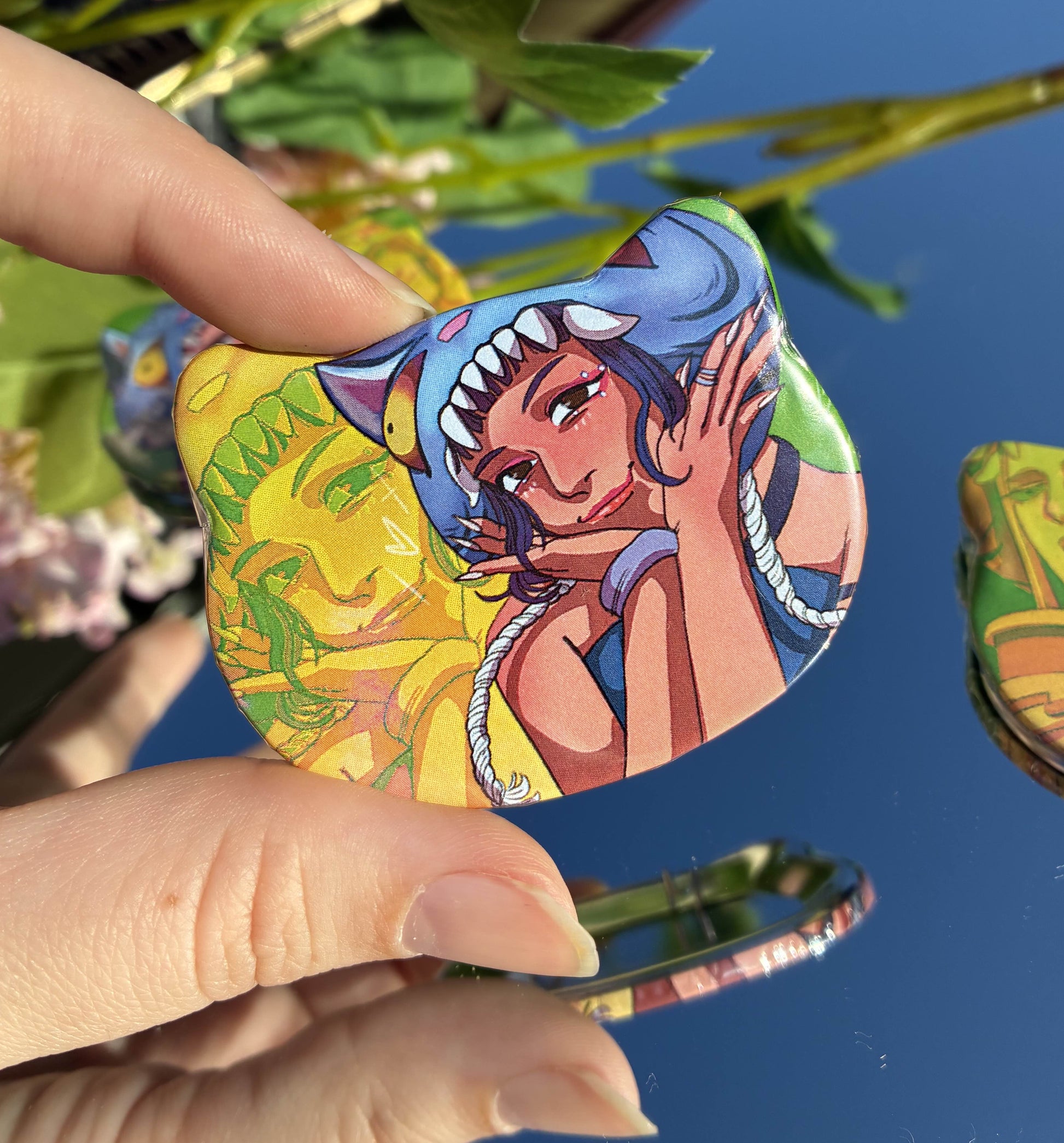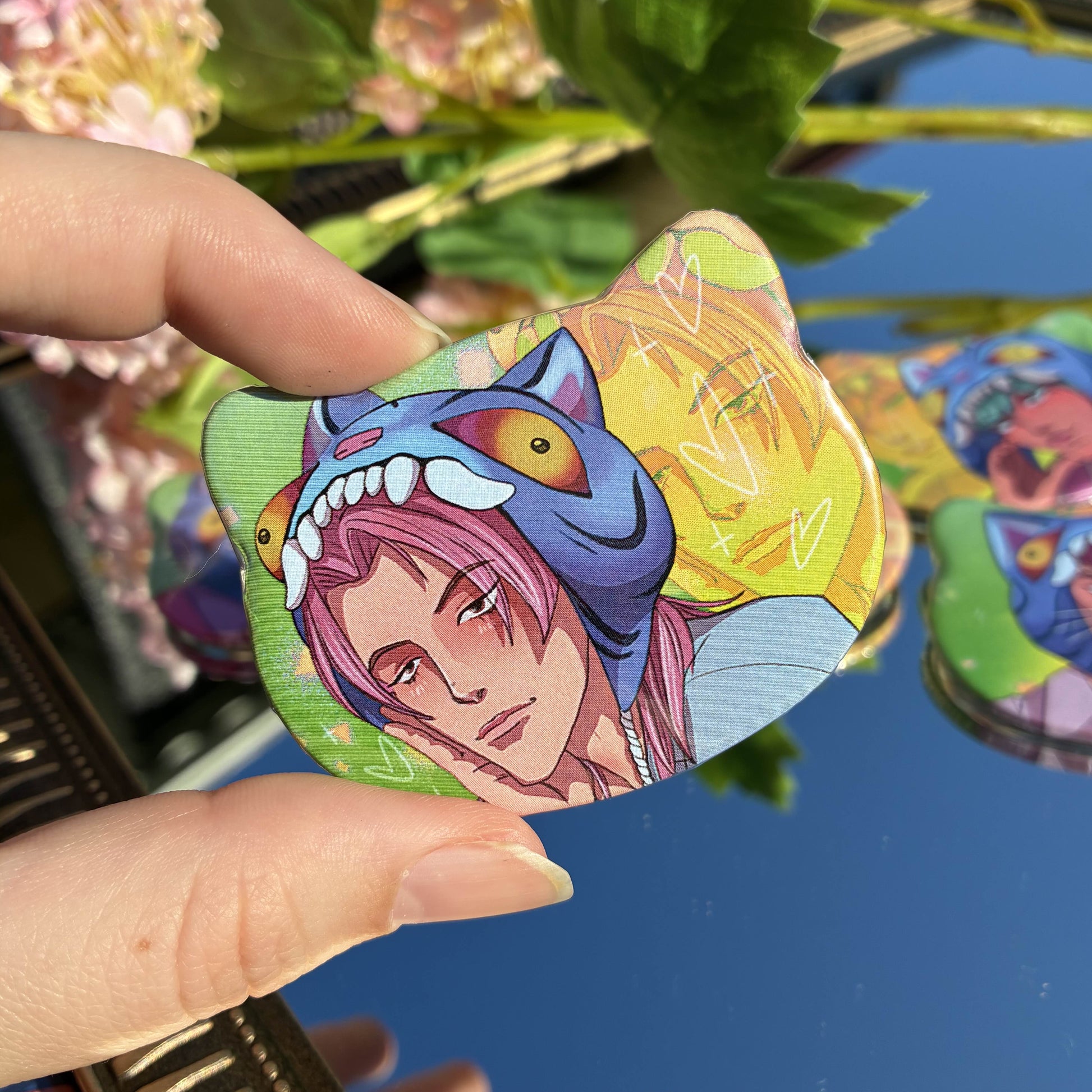 This is a cat-shaped, pinbacked button measuring approximately 2.5" wide.