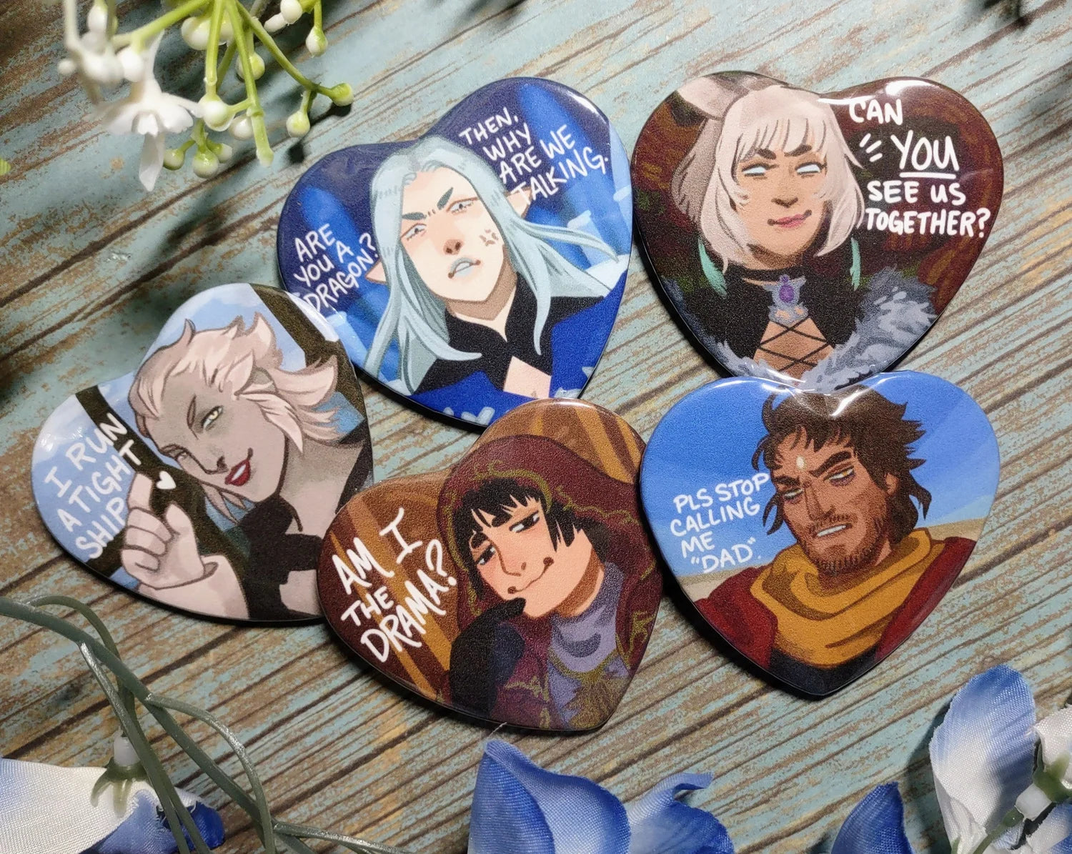 This is a heart-shaped, pinbacked button measuring approximately 2.5" wide.