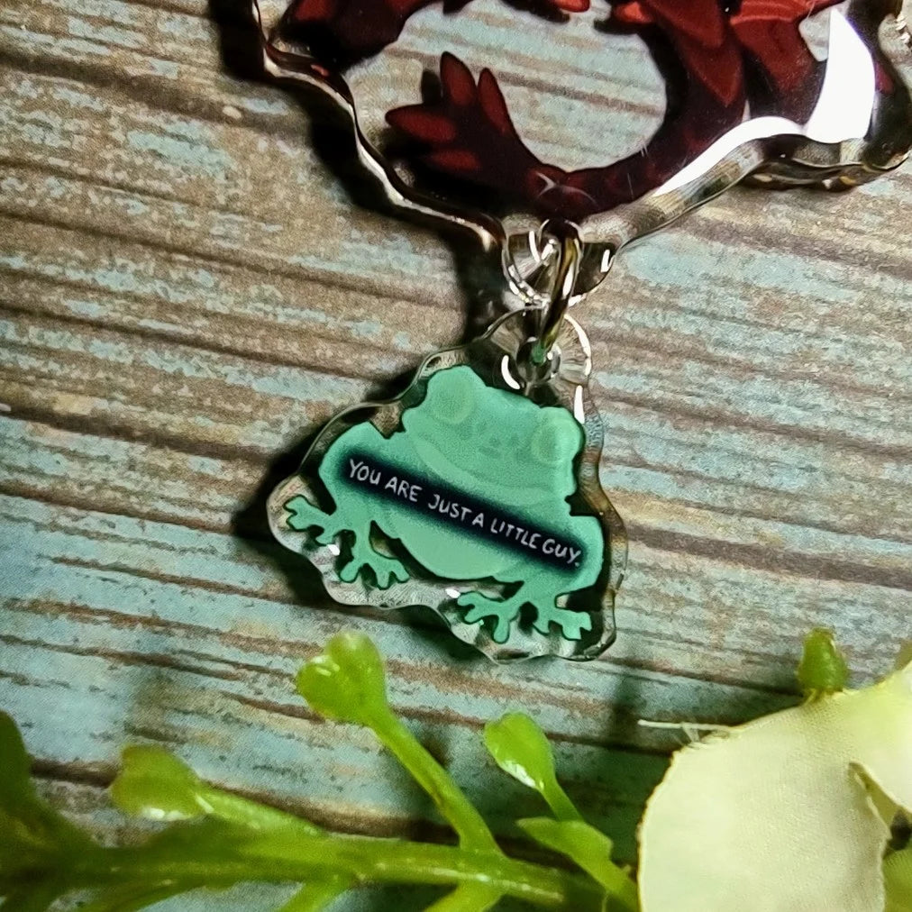 Acrylic charms are made of plastic, which means that they are waterproof but somewhat vulnerable to scratching. The rings holding the two pieces of acrylic together are somewhat malleable, to try to avoid fastening it to things where the "tail" of the charm could be easily caught. (We've found that they make very fun light pulls, though!)