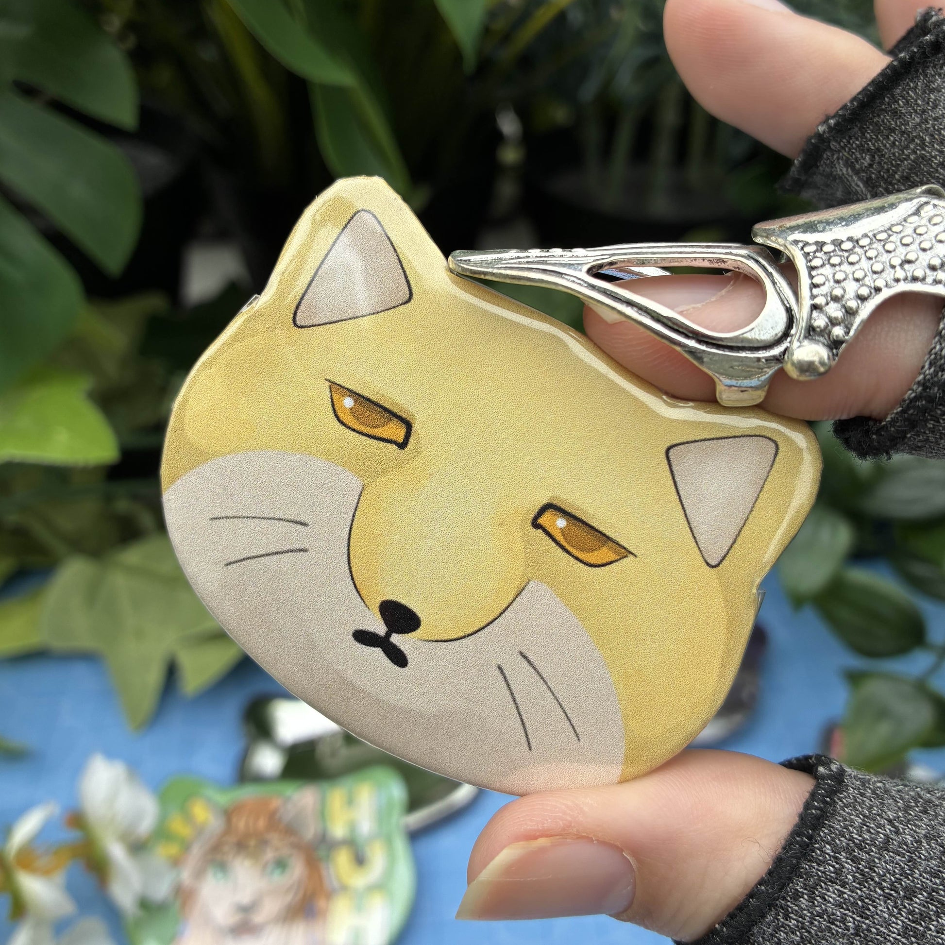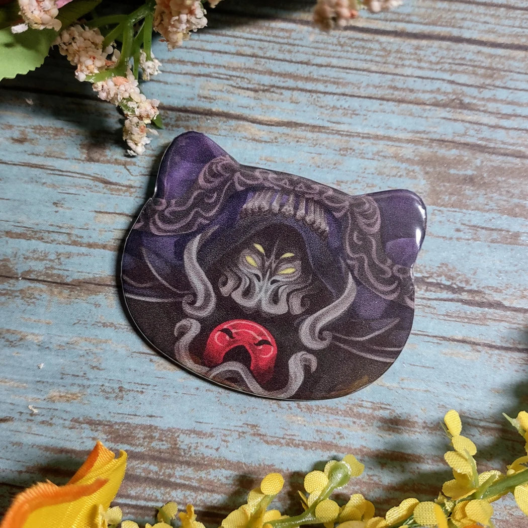 This is a cat-shaped, pinbacked button measuring approximately 2.5" wide.