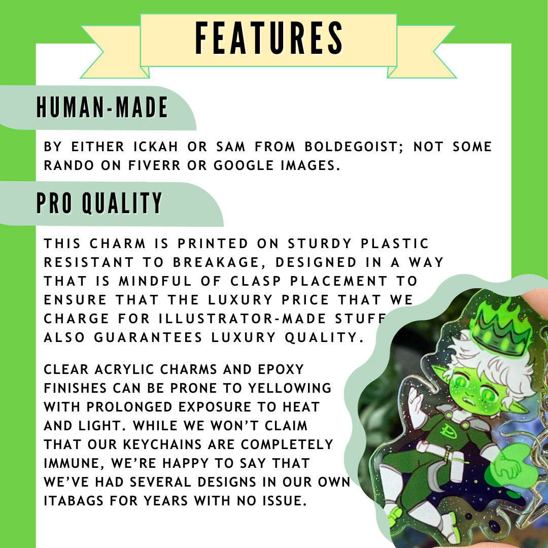 Acrylic charms are made of plastic, which means that they are waterproof but somewhat vulnerable to scratching. The epoxy coating turns it from artwork to functional artwork - it has some durability, but still needs a level of respect.