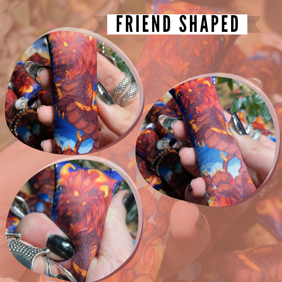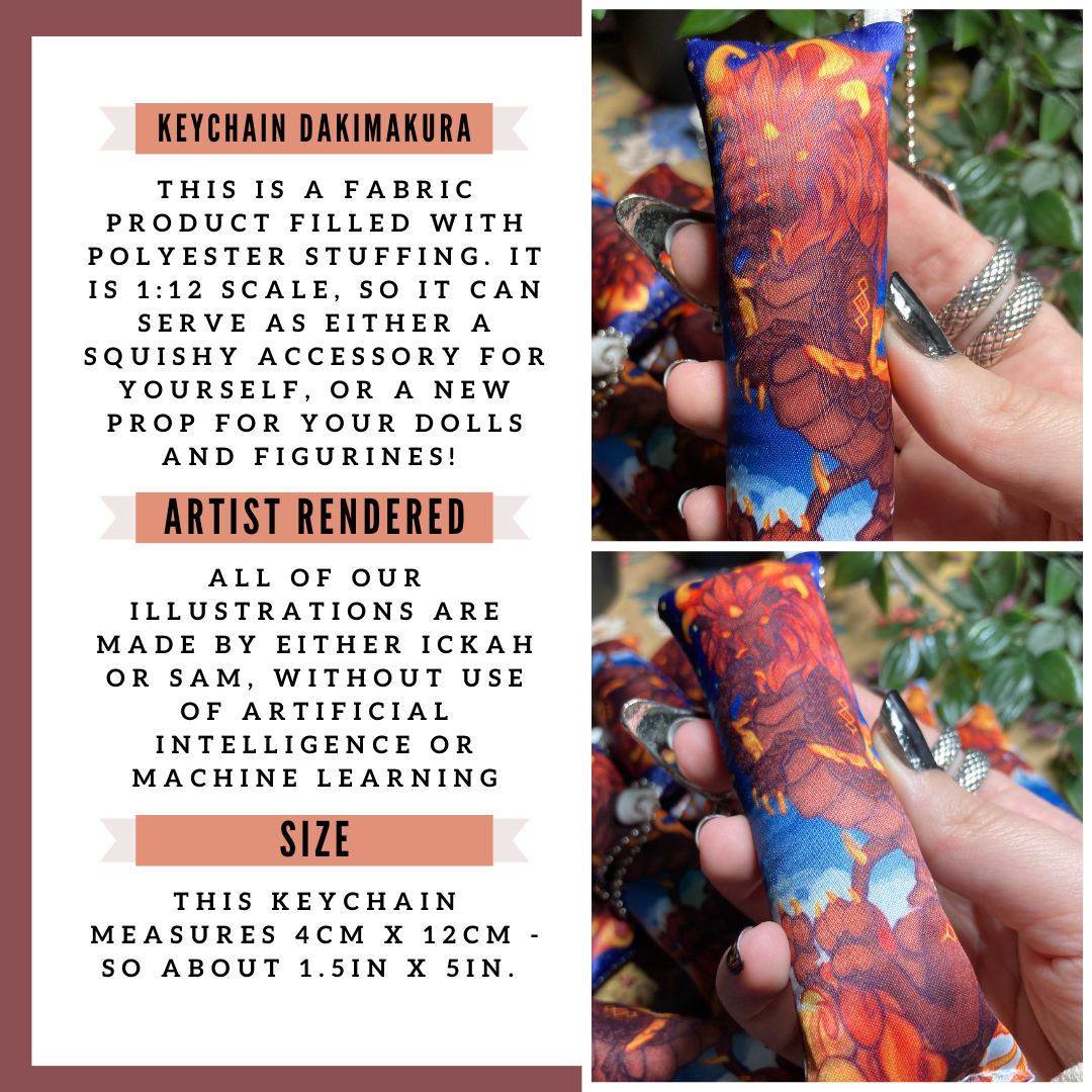 This is a polyester body pillow keychain that measures about 4"x1.5". It's stuffed with polyester filling, and has a "ball chain" style attachment.