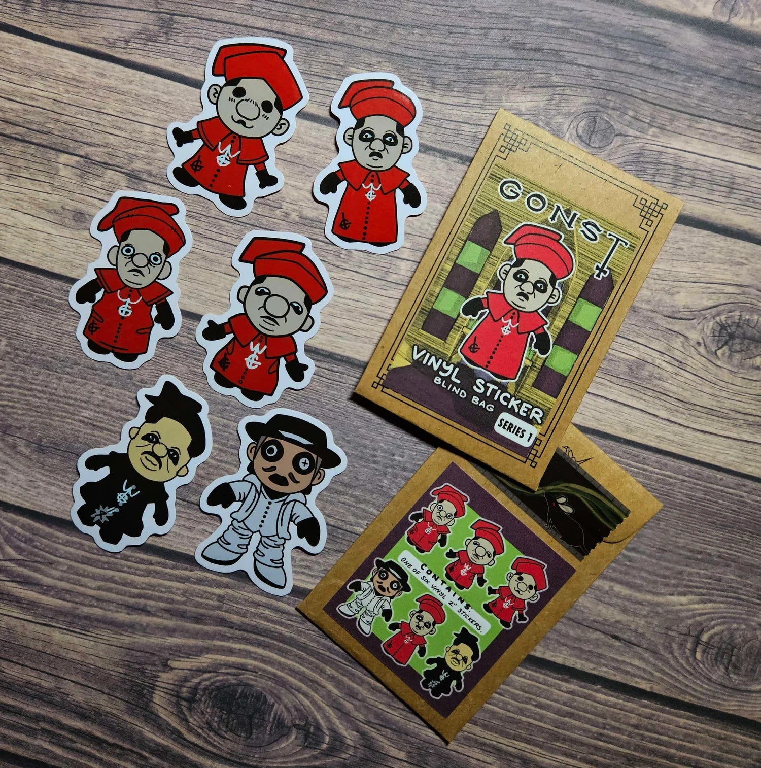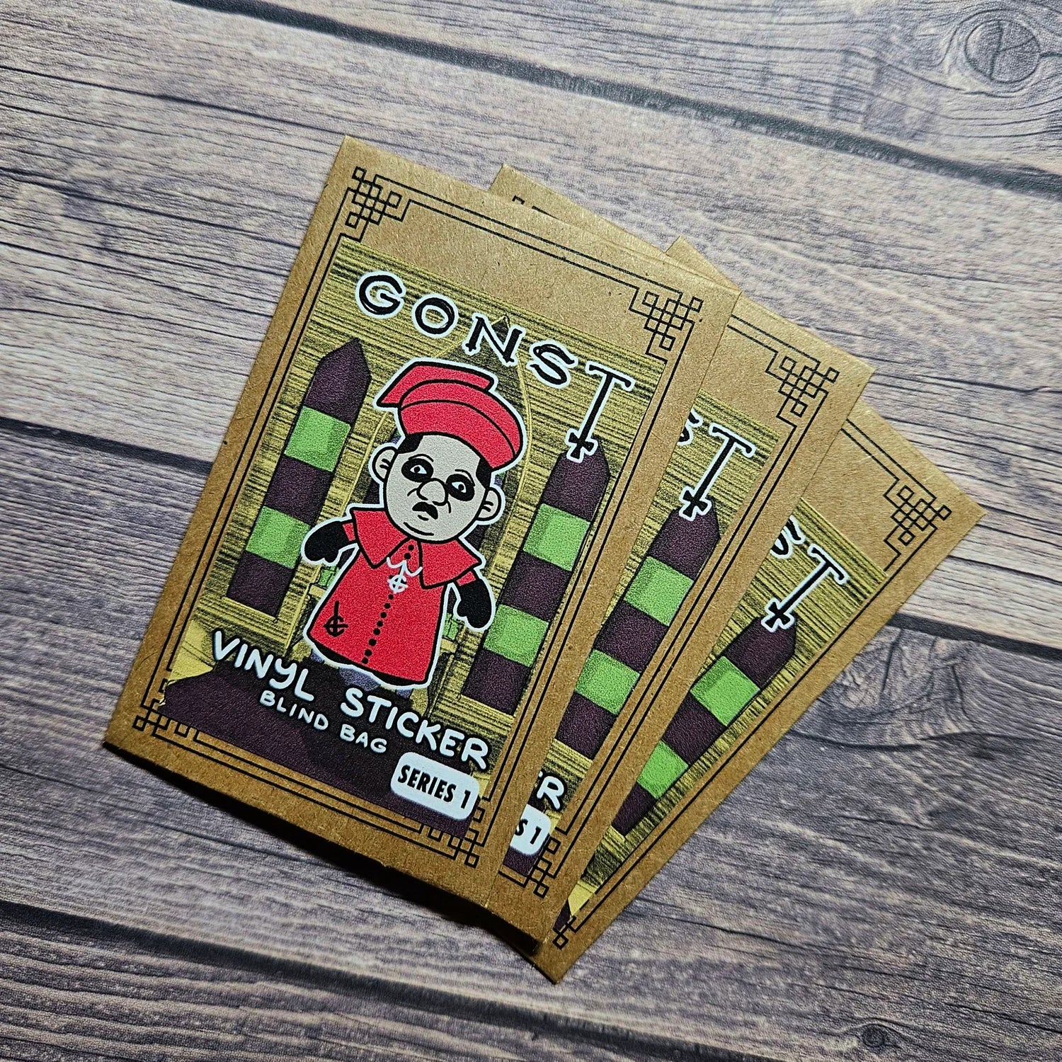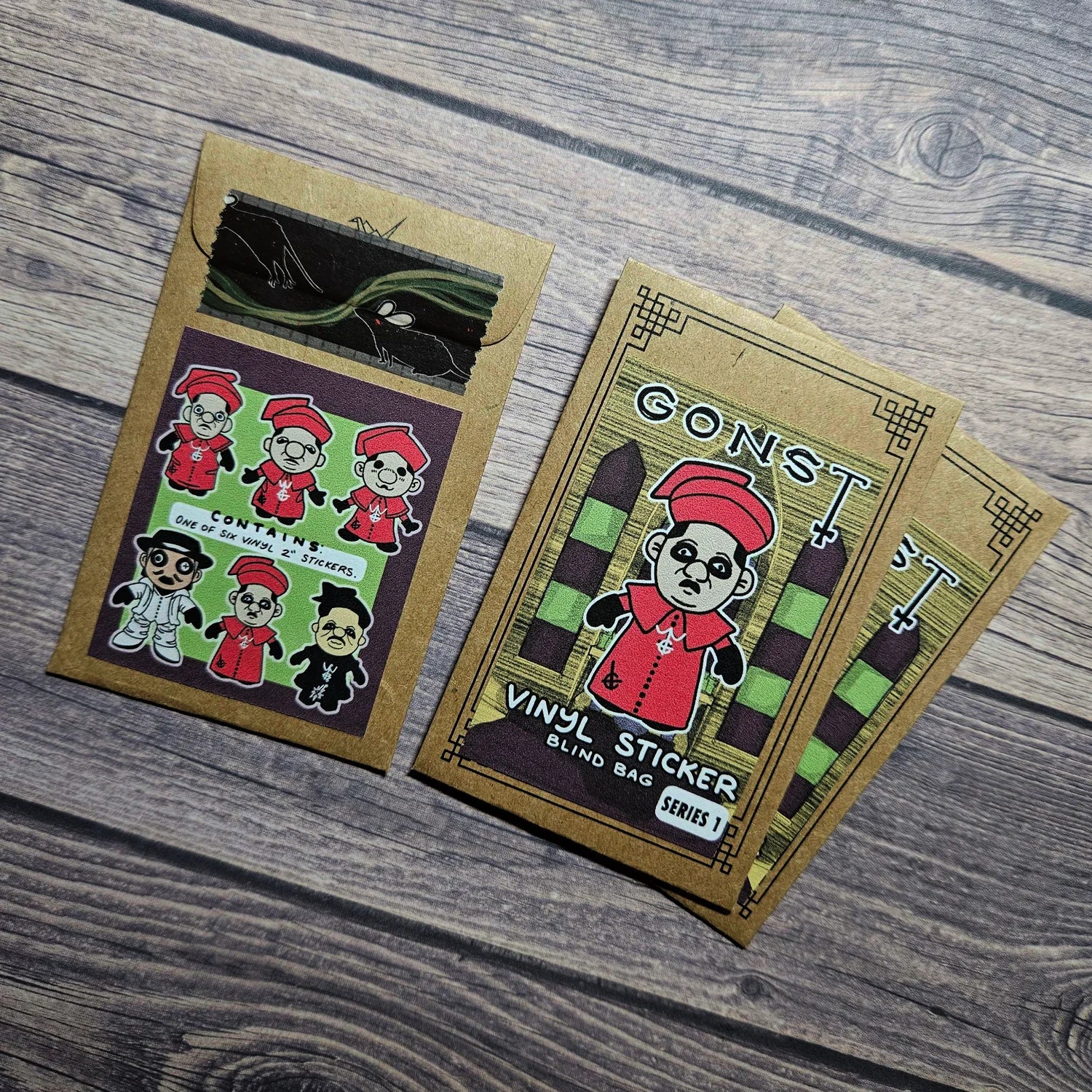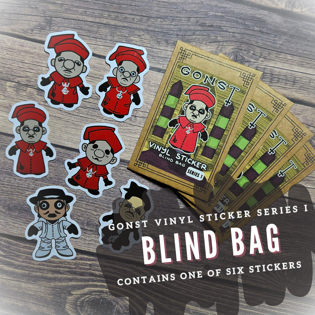 Hand packaged blind bag containing one of six illustrations on a 2 INCH Vinyl Sticker.