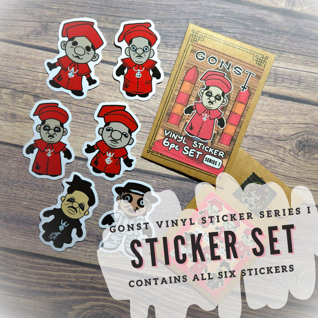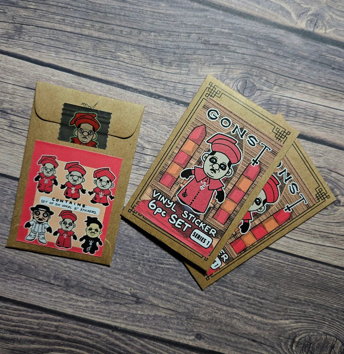 Hand packaged blind bag containing six 2 INCH vinyl stickers of the depicted illustrations!