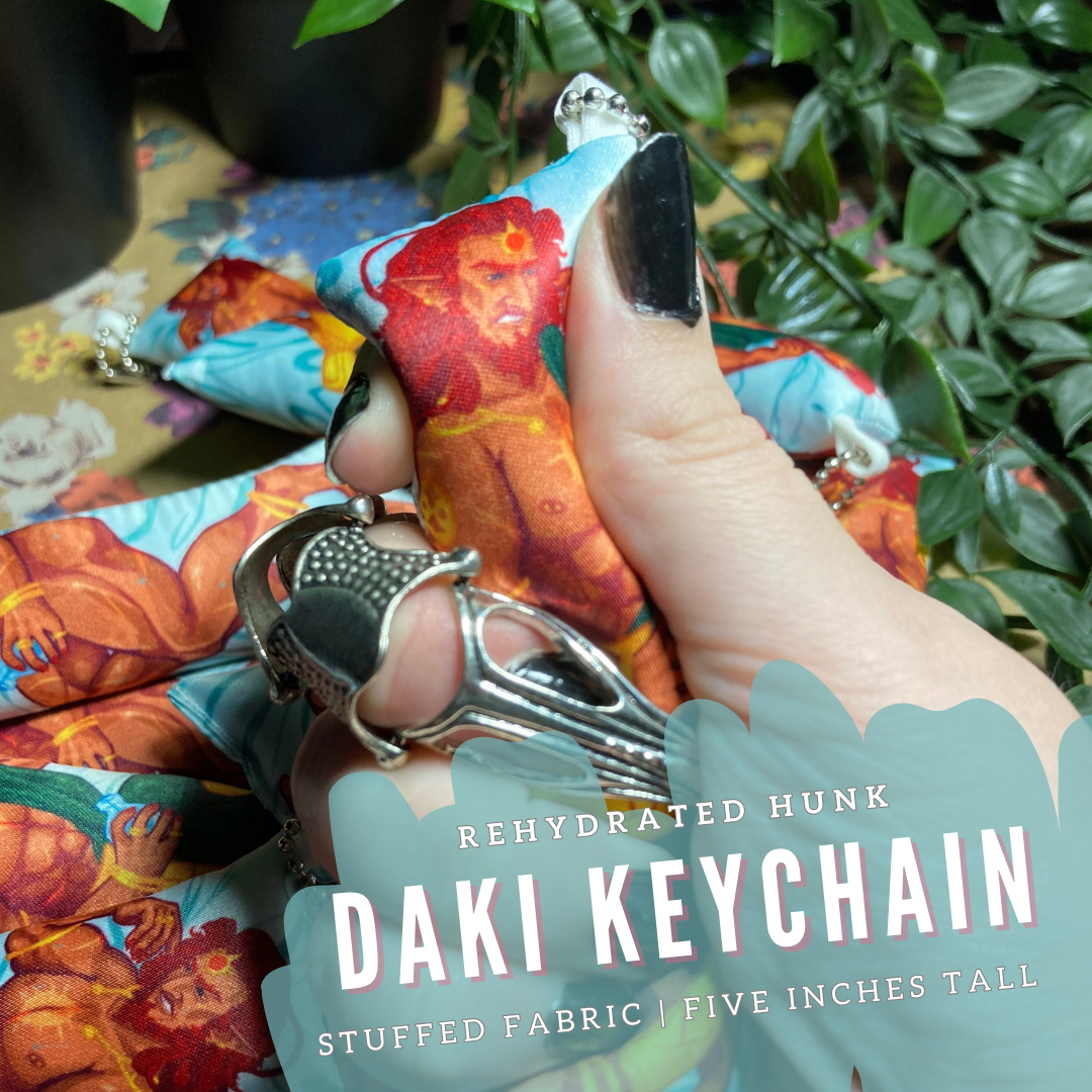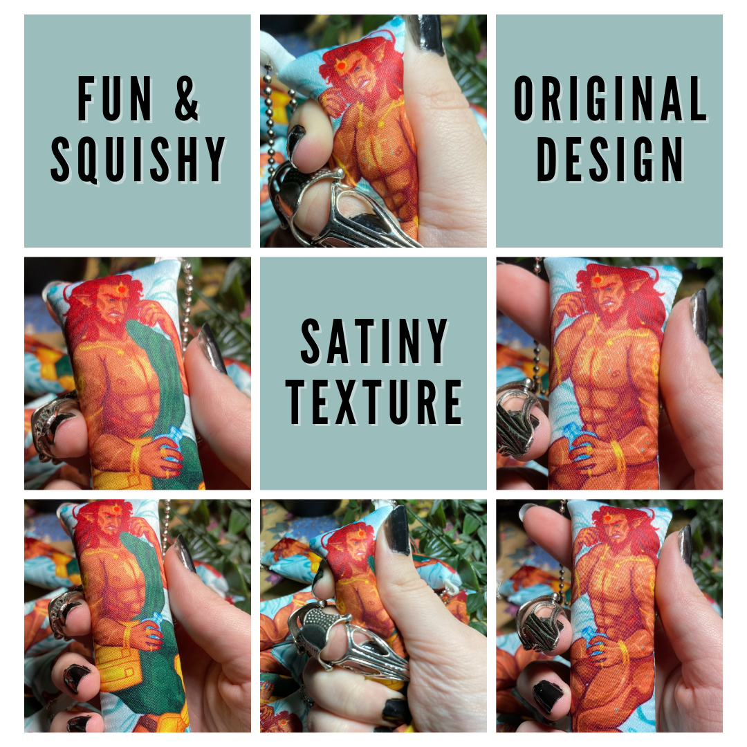 This is a polyester body pillow keychain that measures about 4"x1.5". It's stuffed with polyester filling, and has a "ball chain" style attachment.