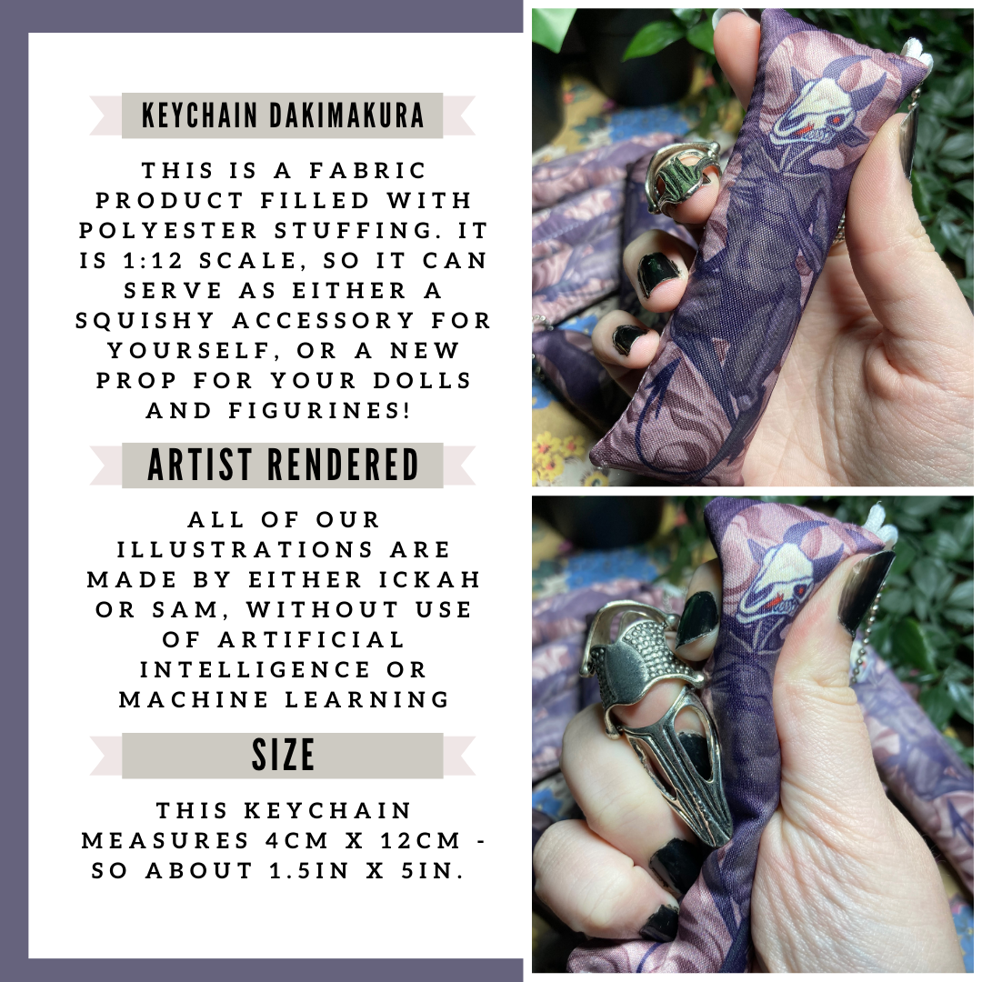 This is a polyester body pillow keychain that measures about 4"x1.5". It's stuffed with polyester filling, and has a "ball chain" style attachment.