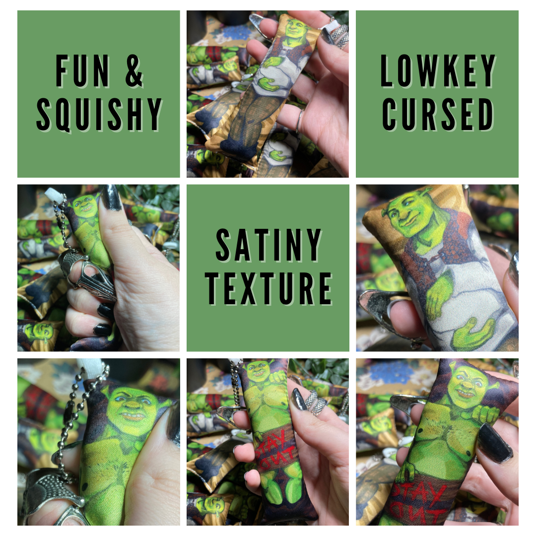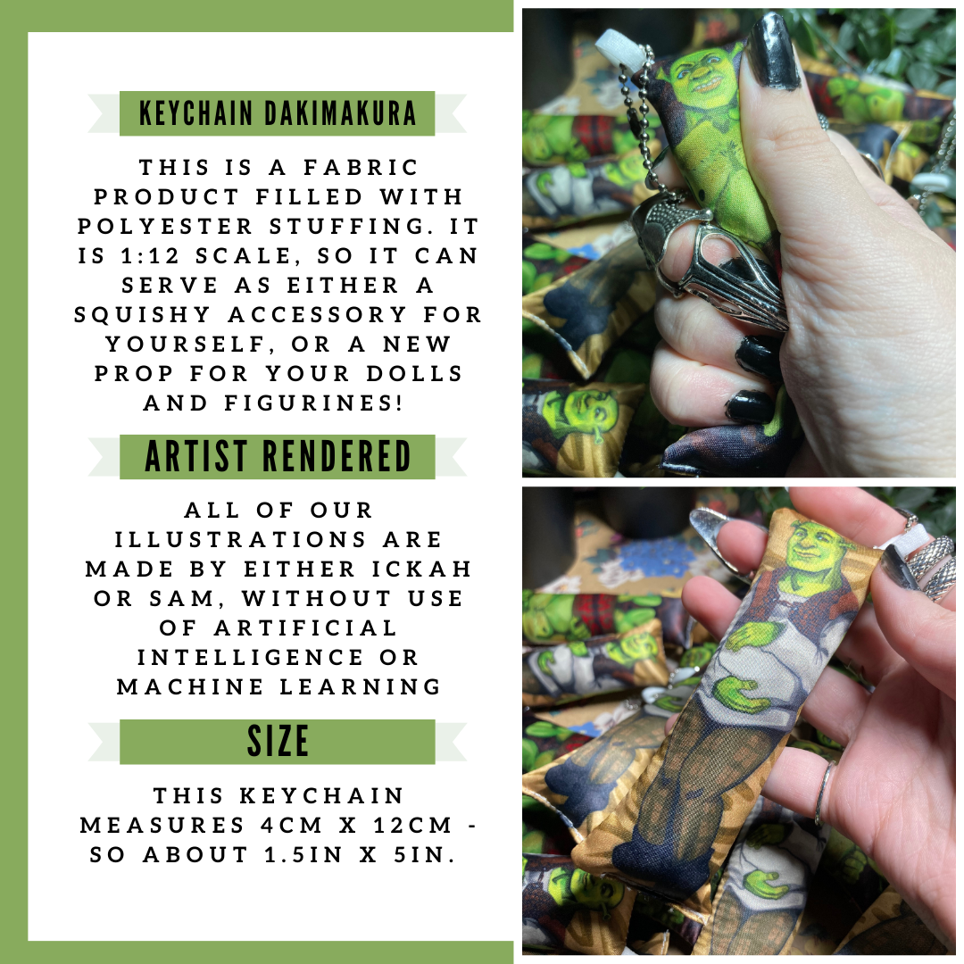 This is a polyester body pillow keychain that measures about 4"x1.5". It's stuffed with polyester filling, and has a "ball chain" style attachment.