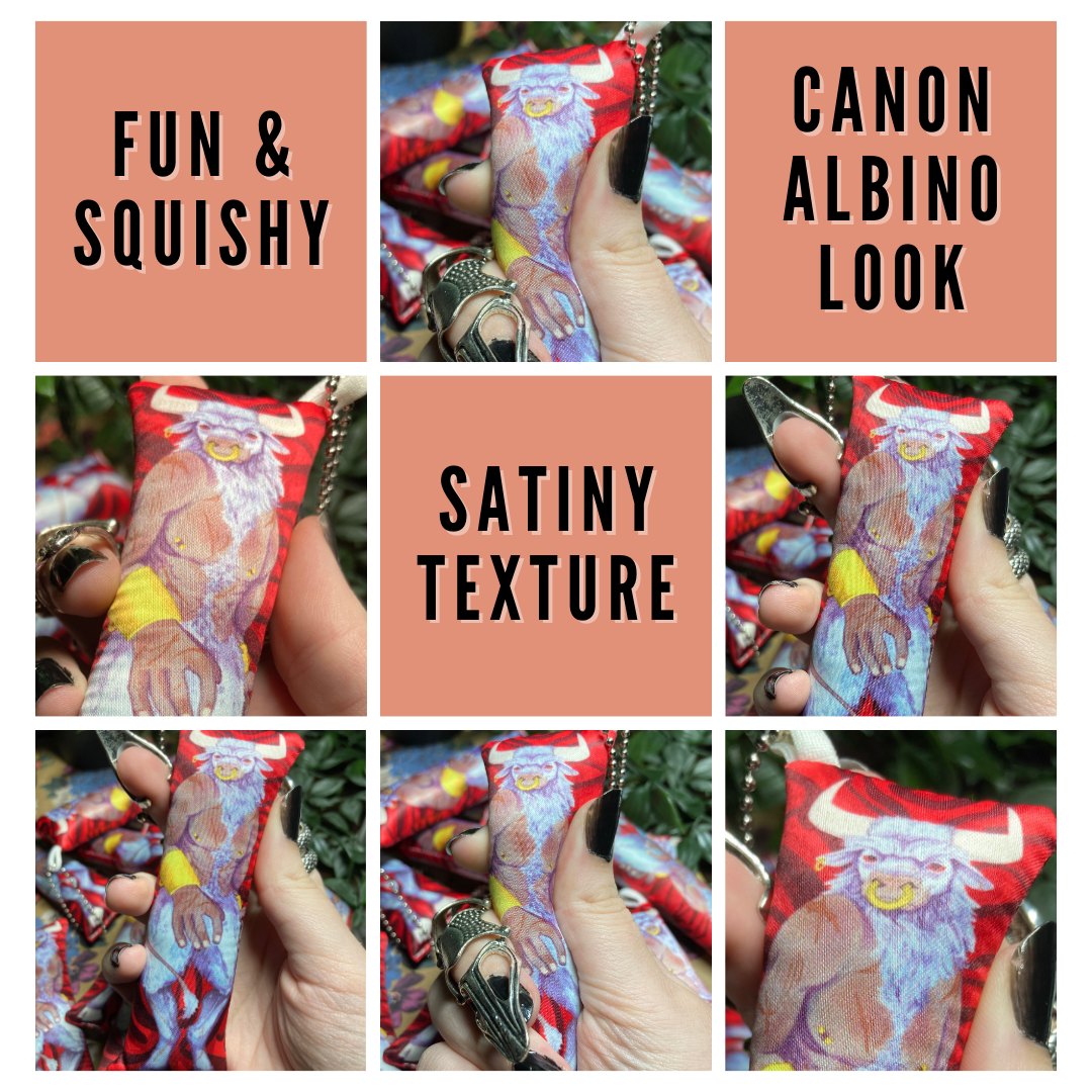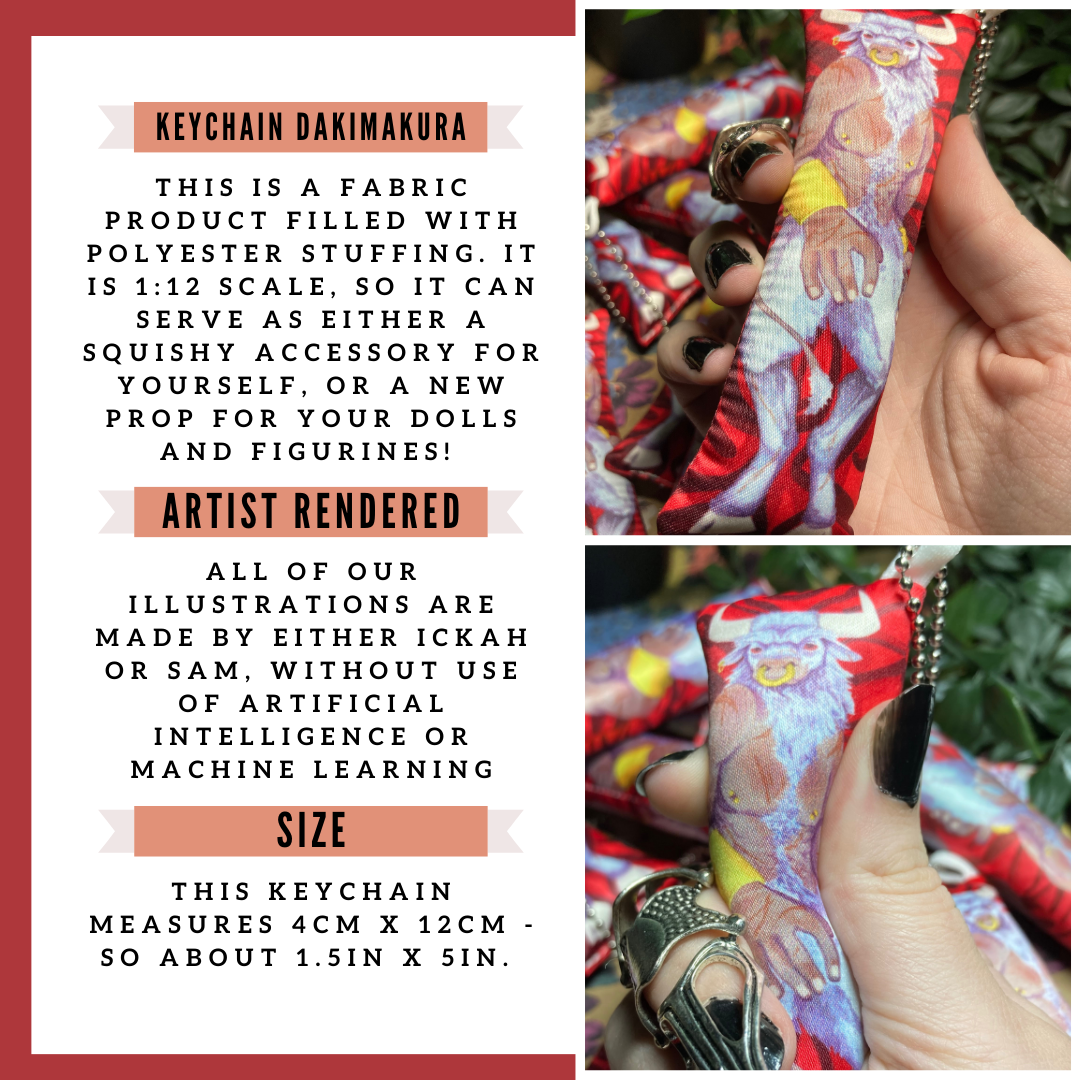 This is a polyester body pillow keychain that measures about 4"x1.5". It's stuffed with polyester filling, and has a "ball chain" style attachment.
