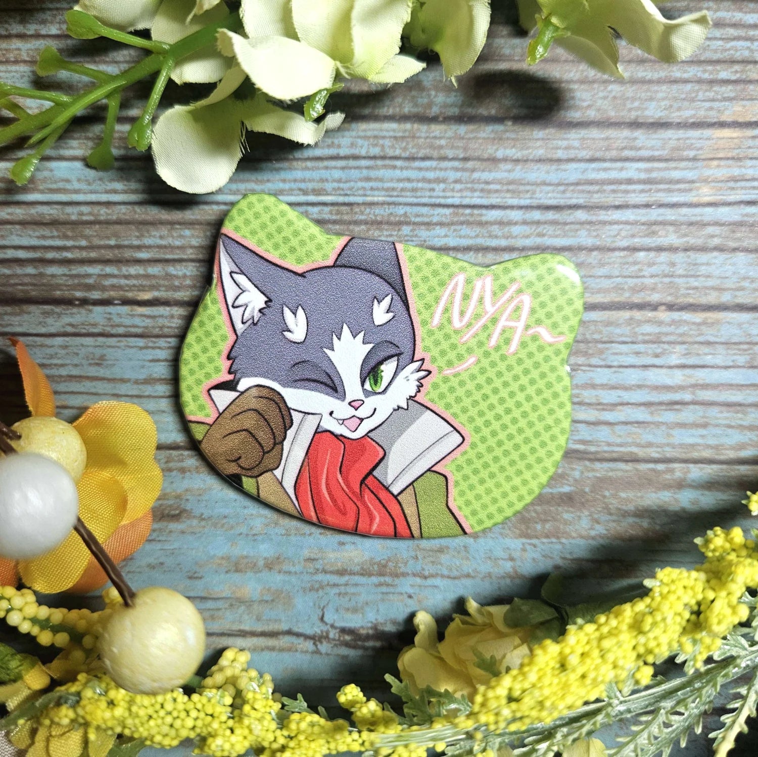 This is a cat-shaped, pinbacked button measuring approximately 2.5" wide.