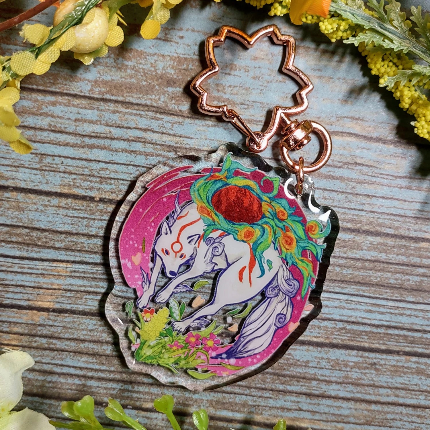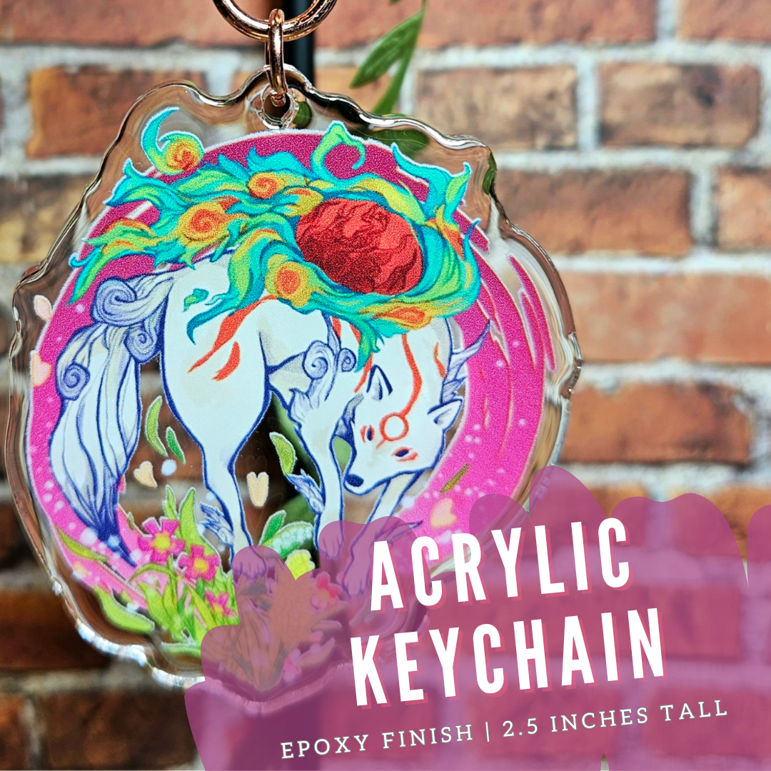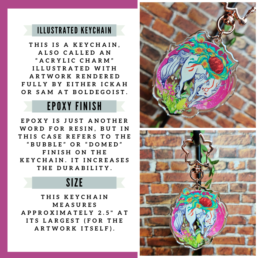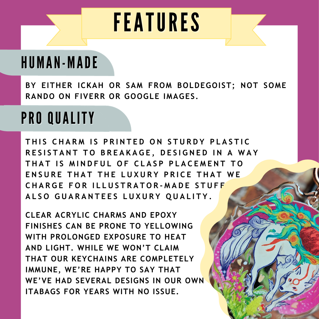Acrylic charms are made of plastic, which means that they are waterproof but somewhat vulnerable to scratching. The epoxy coating turns it from artwork to functional artwork - it has some durability, but still needs a level of respect. (We've had one of our epoxy charms on our car keys since 2021 with no issue, but it's not competing with 30 keys and 5 other keychains. Assess the risk yourself before attaching it to something!)