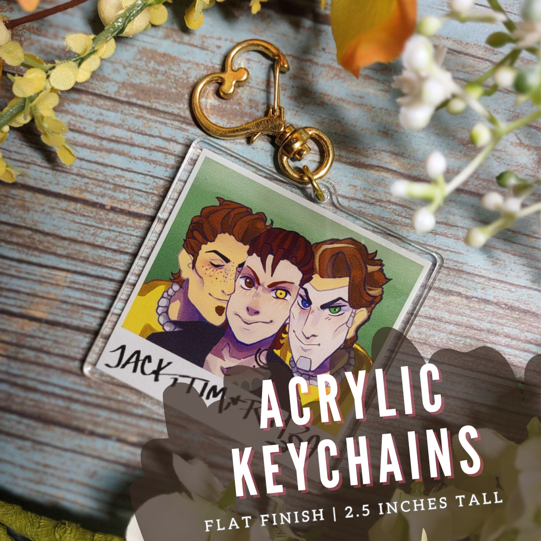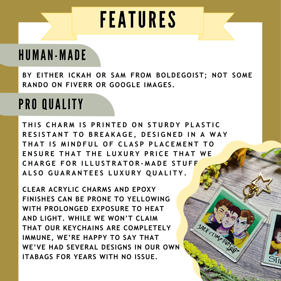 Acrylic charms are made of plastic, which means that they are waterproof but somewhat vulnerable to scratching. The epoxy coating turns it from artwork to functional artwork - it has some durability, but still needs a level of respect. (We've had one of our epoxy charms on our car keys since 2021 with no issue, but it's not competing with 30 keys and 5 other keychains. Assess the risk yourself before attaching it to something!)