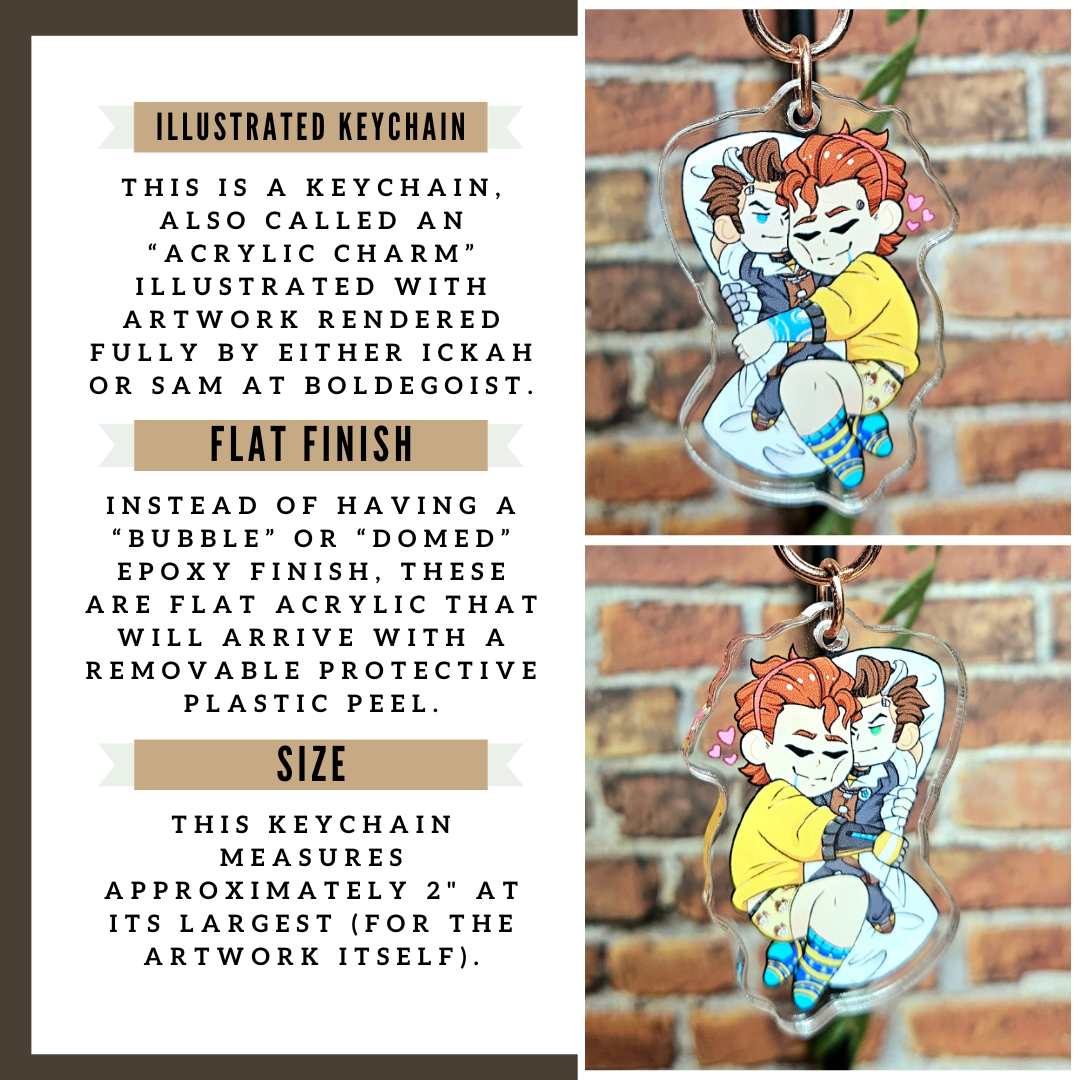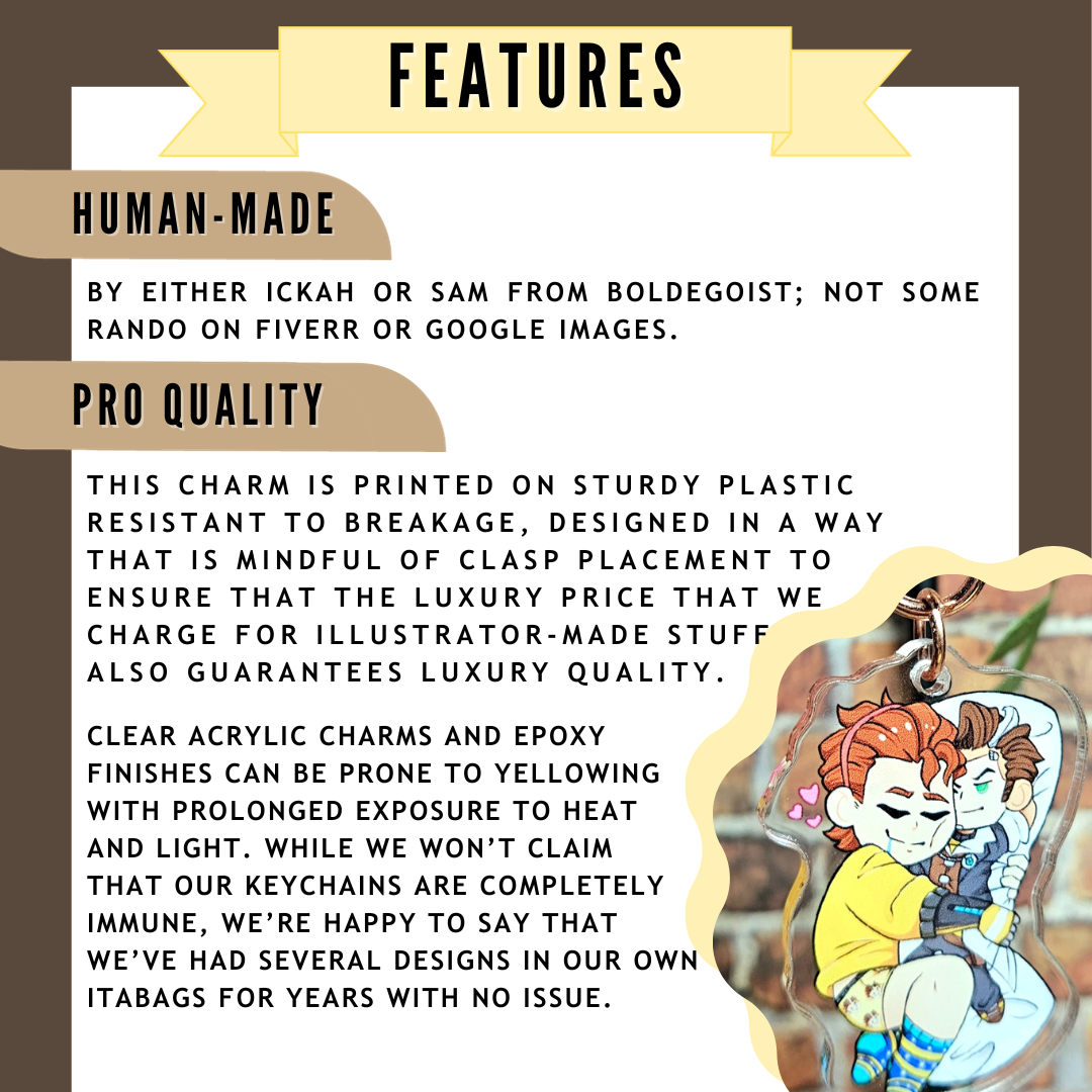 Acrylic charms are made of plastic, which means that they are waterproof but somewhat vulnerable to scratching. The epoxy coating turns it from artwork to functional artwork - it has some durability, but still needs a level of respect.