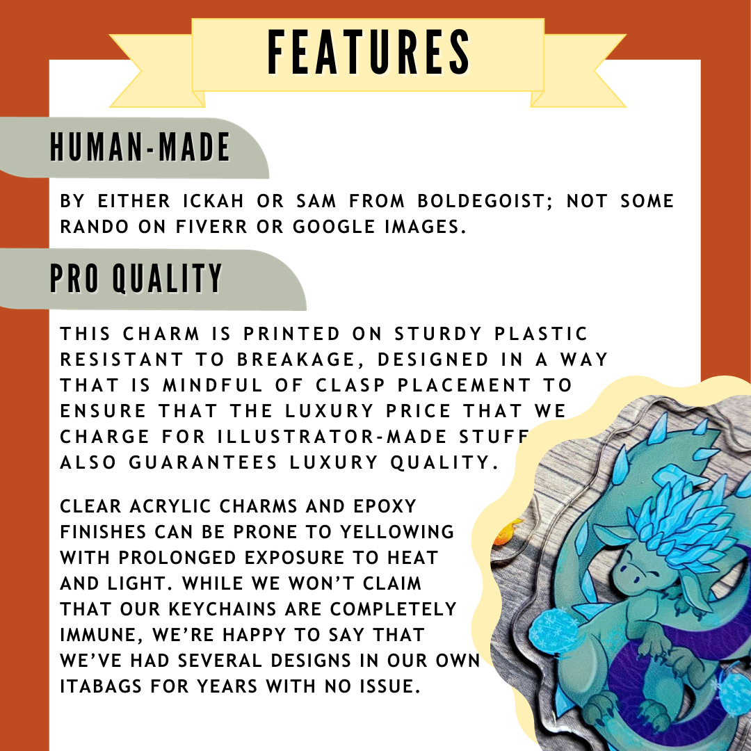 Acrylic charms are made of plastic, which means that they are waterproof but somewhat vulnerable to scratching. The epoxy coating turns it from artwork to functional artwork - it has some durability, but still needs a level of respect.