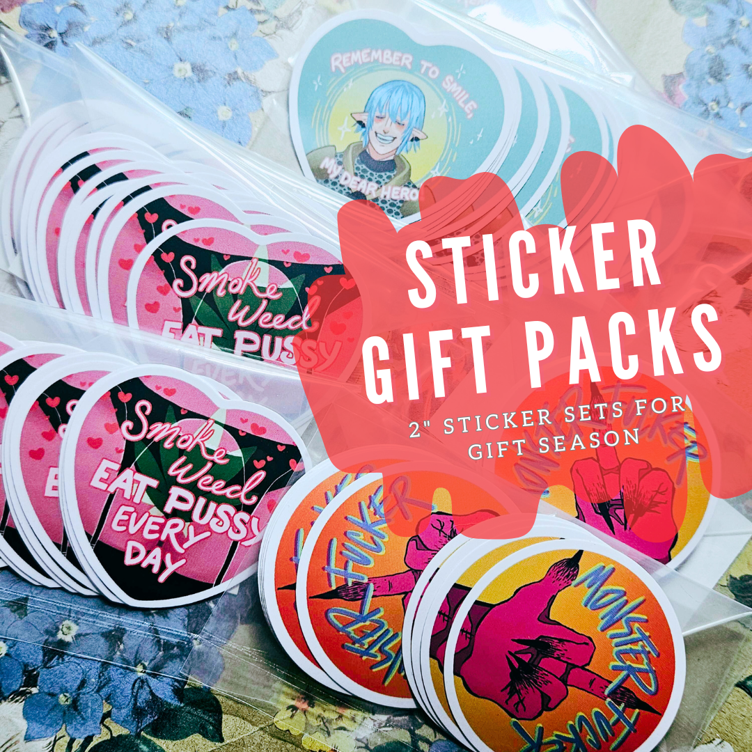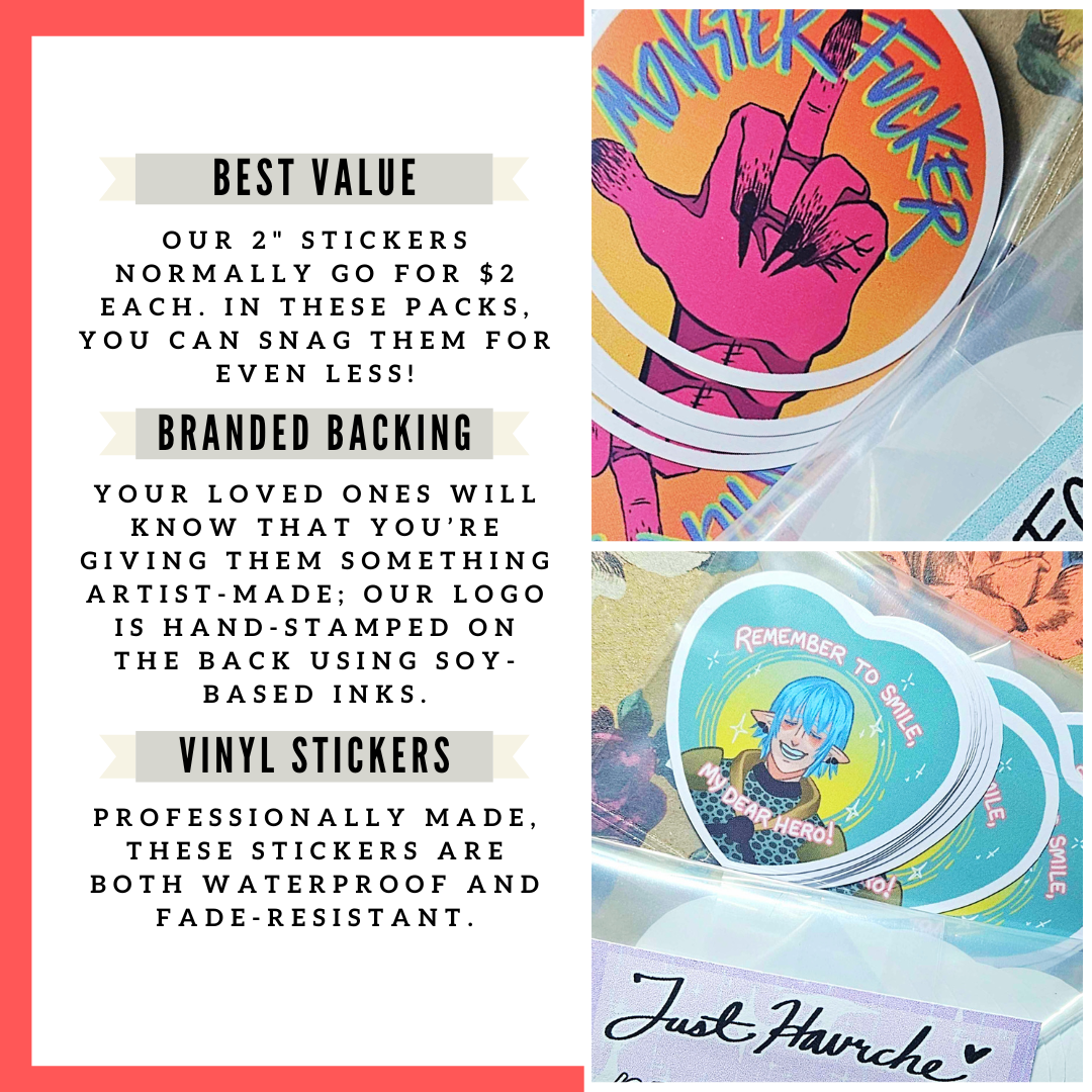 Hand packaged transparent bag containing ten 2 INCH vinyl stickers of the depicted illustrations! ($20 value)
