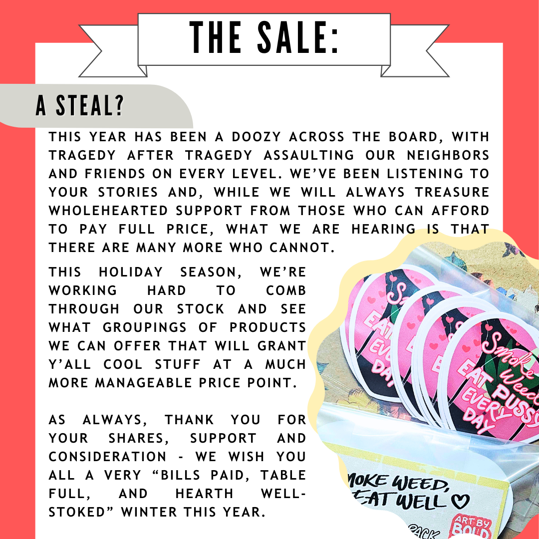 "Bold," you ask, "Why are you offering these for so flippin' cheap?" Well, buddy - it's been a year. We've had to cancel a couple shows due to illness and emergencies, so we've got overstock for some things that we'd rather have as space for new products - and, frankly, a lot of our favorite patrons and customers are in dire financial straits. It's been a rough year, and we'd rather have lighter pockets and smiles on y'alls faces. Which, when translated to marketing speak, means that this is a SUPER EXCLUSIVE, ONCE IN A BLUE MOON SALE - the discounts that you'll see in these bundles will be significantly lower than what you could grab with any coupon or convention deal. For that reason, they're not eligible for "%off your order" coupons - you can still add it to cart, but the coupon won't apply to this product. It IS still eligible for free or discounted shipping on purchases over $35USD.