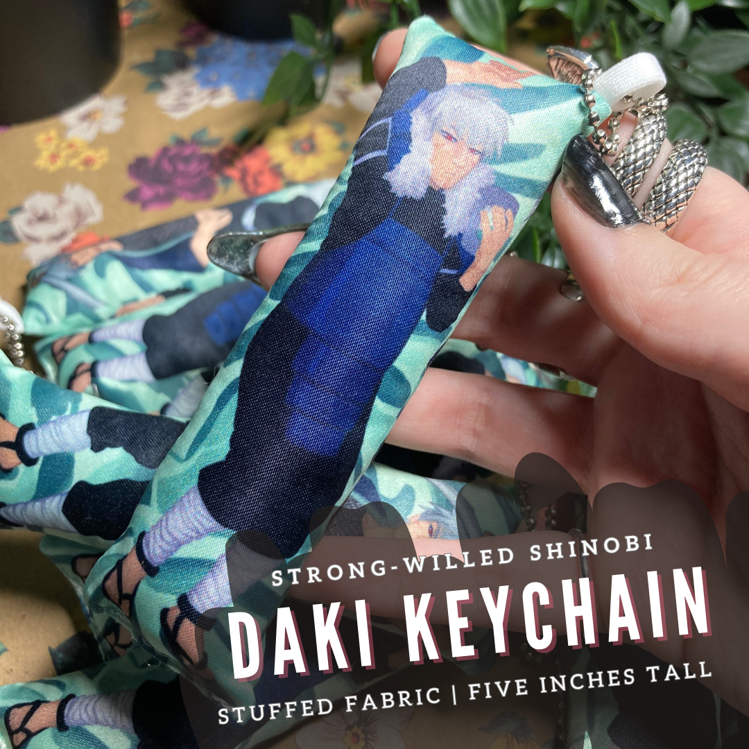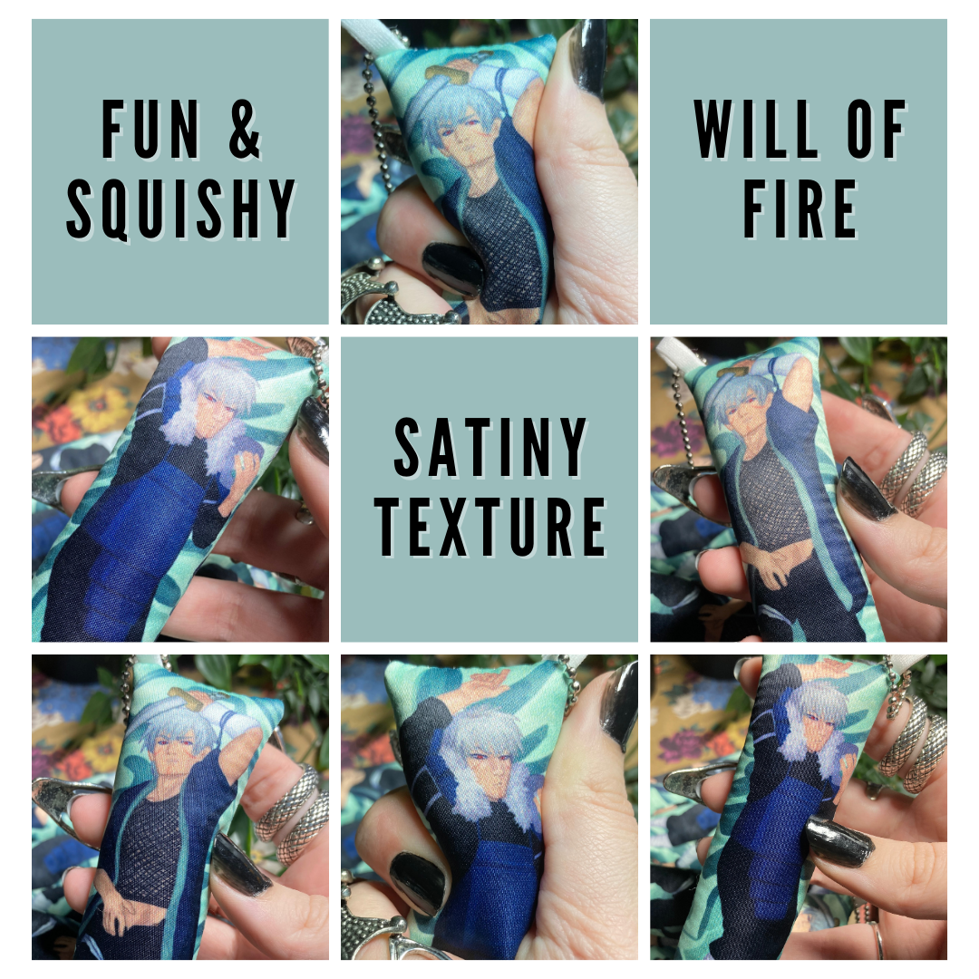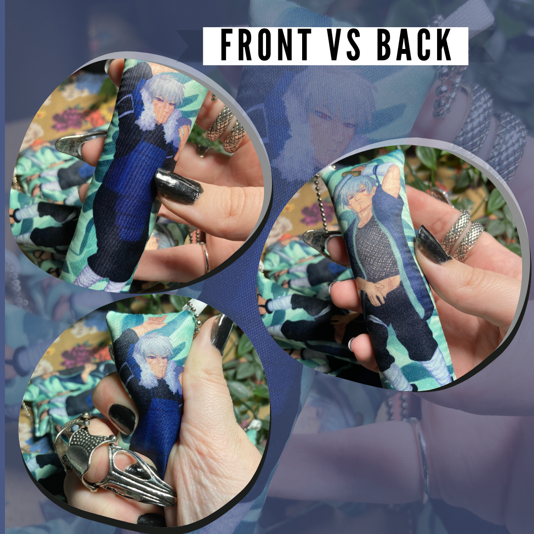 This is a polyester body pillow keychain that measures about 4"x1.5". It's stuffed with polyester filling, and has a "ball chain" style attachment.
