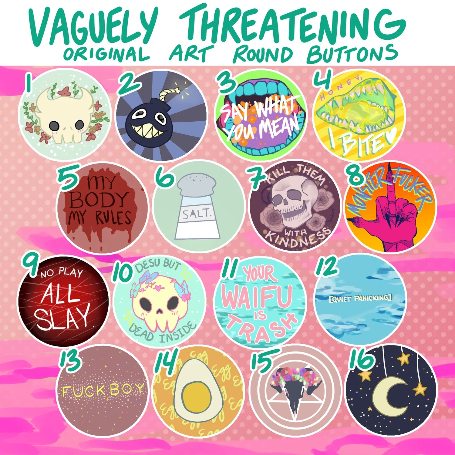This is a round, pinbacked button measuring approximately 1.75" in diameter.