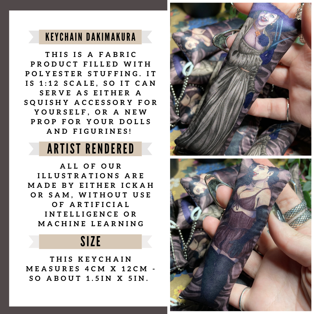 This is a polyester body pillow keychain that measures about 4"x1.5". It's stuffed with polyester filling, and has a "ball chain" style attachment.