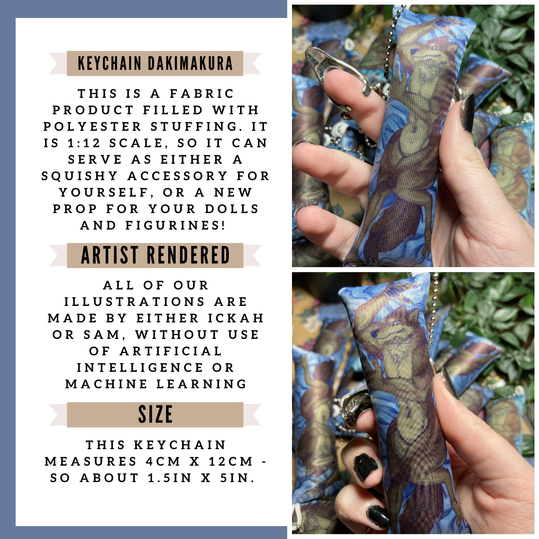 This is a polyester body pillow keychain that measures about 4"x1.5". It's stuffed with polyester filling, and has a "ball chain" style attachment.